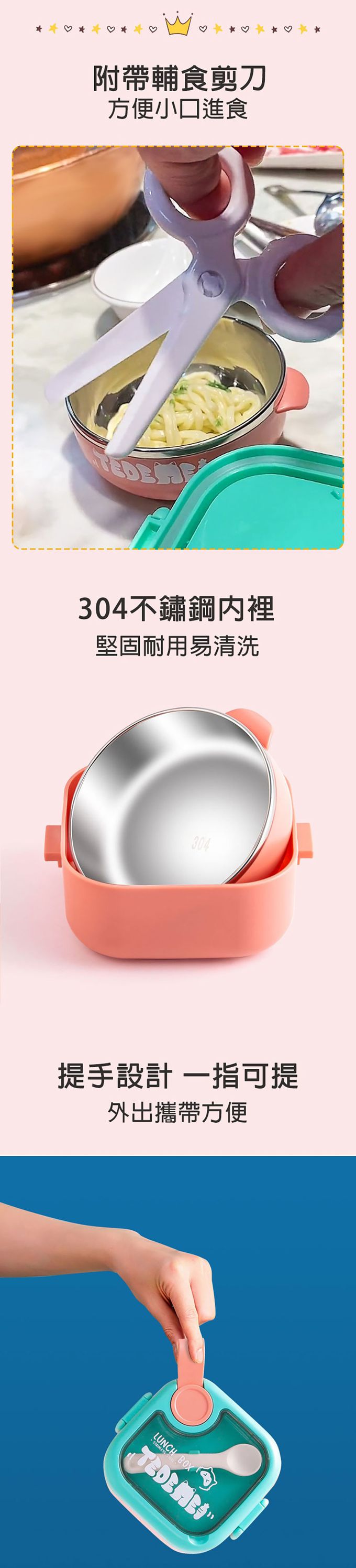 【主要材質】碗內層:304不鏽鋼/按鈕.湯匙.盒蓋.盒身.鎖扣.碗:聚丙烯材質/半透明碗蓋:丙烯腈材質