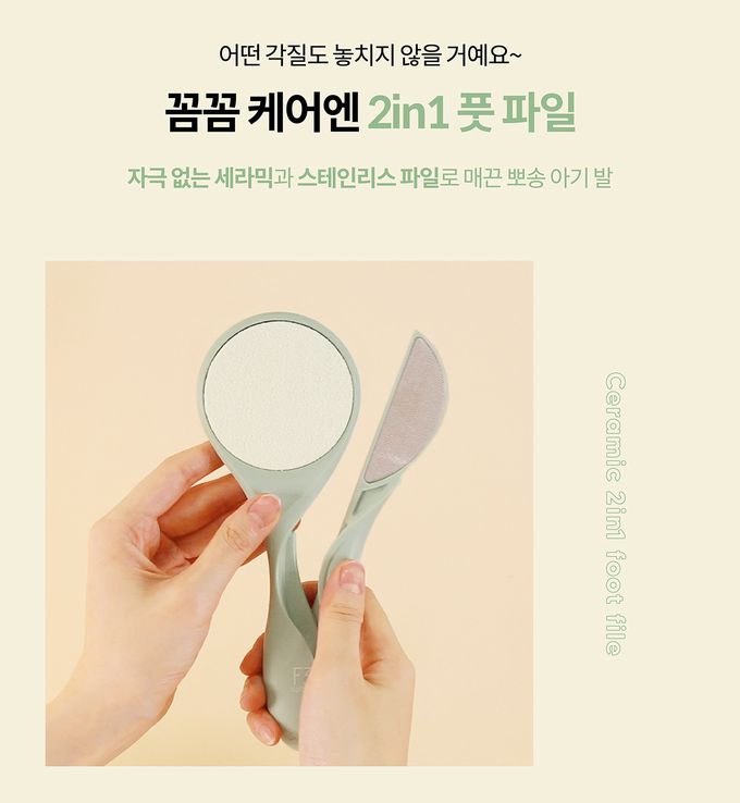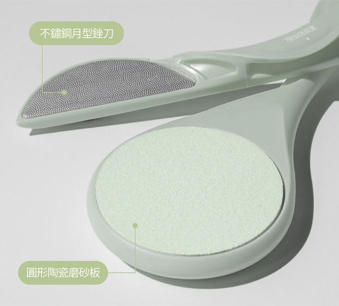 圓形陶瓷磨砂板:抗污的陶瓷材質,溫和磨去大面積角質月型銼刀:不鏽鋼製成的銼刀可以深入去除較窄位置的死皮,不只能用於磨腳皮,也能磨去手指指間的死皮。