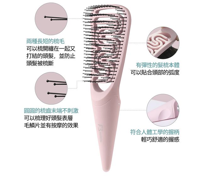 兩種不同長短的梳毛,不管是濕髮狀態使用,還是用來解決打結亂髮,都能輕柔的梳開梳順,並降低拉扯時掉頭髮或頭髮受損的情況!圓潤的梳齒末端不刺激,用來按摩頭皮超舒服!特殊的曲線型梳面設計,梳頭時能依照不同頭型貼合弧度,讓梳髮效果更柔順,也能達到完美按摩效果洗頭前使用可以將老廢角質清理出來,讓後續洗頭清潔更徹底;睡前使用可以幫助血液循環。防止靜電的效果才不會讓頭髮看起來好像越梳越毛躁,梳到抓狂!