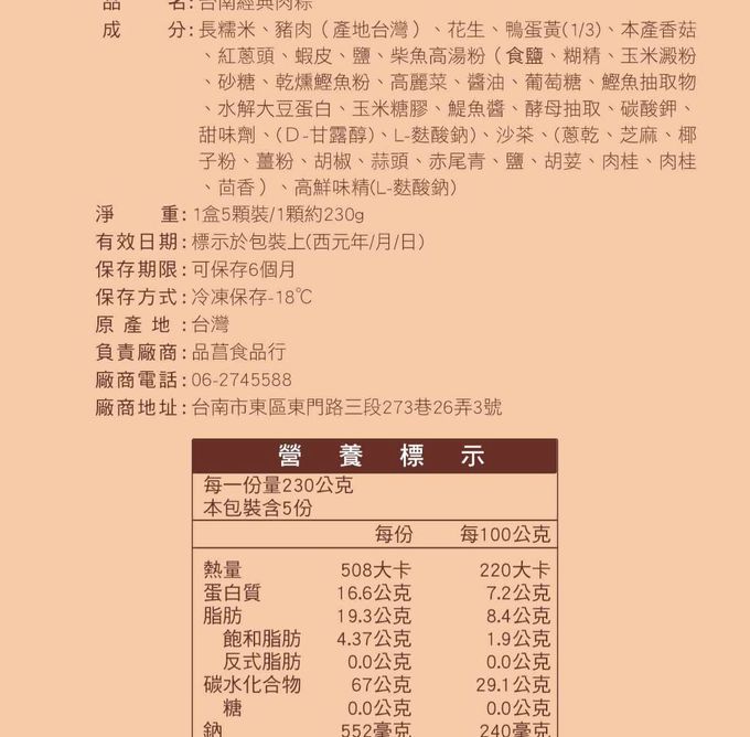 品名:品香肉粽台南經典肉粽(230g*5顆)