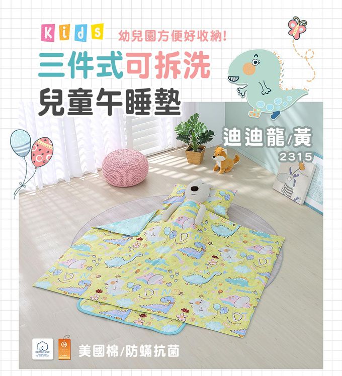 鴻宇 HongYew - 兒童三件式睡袋 防螨抗菌100%美國棉 睡墊 涼被 枕頭-迪迪龍2315-黃