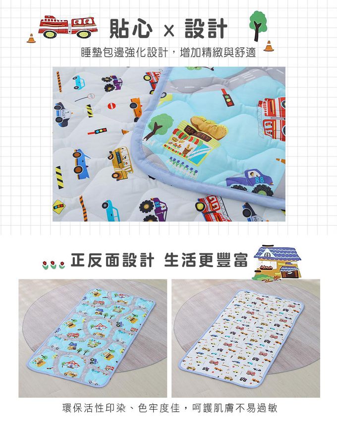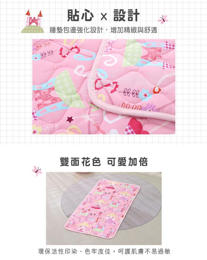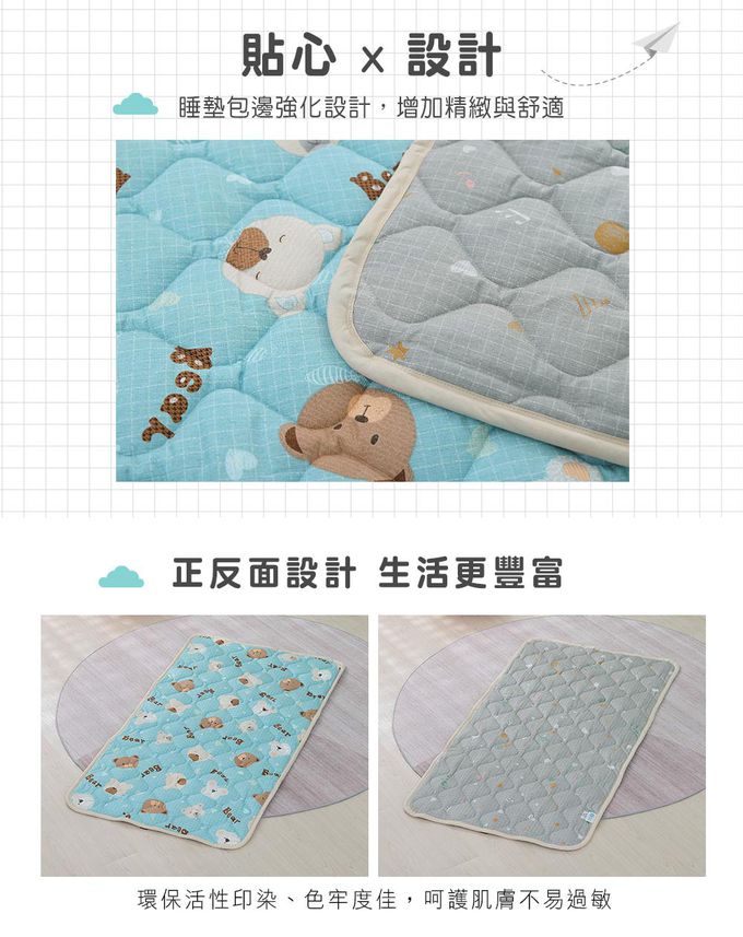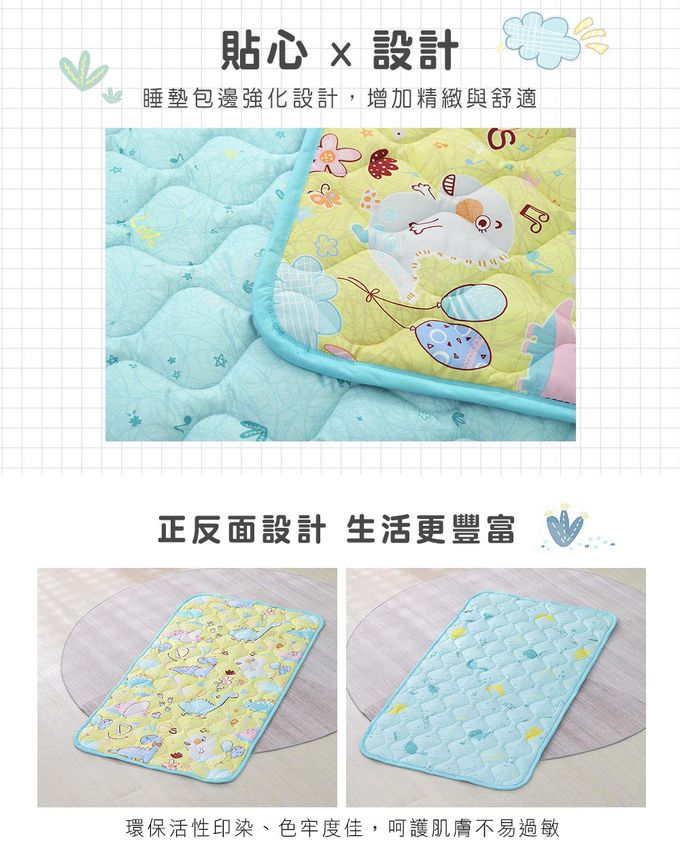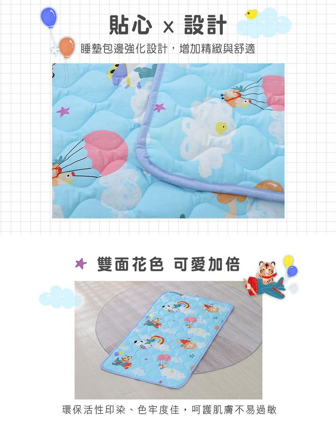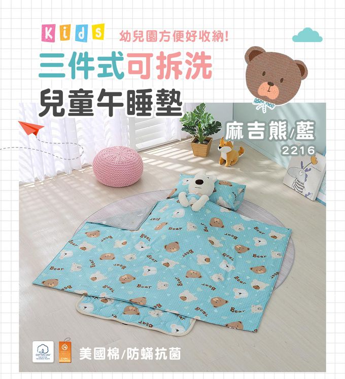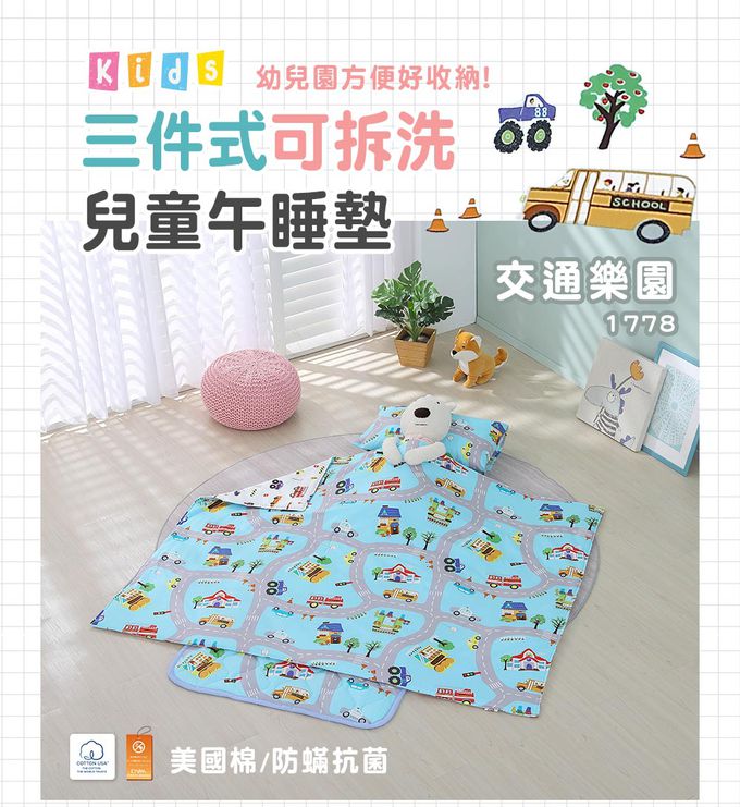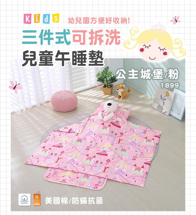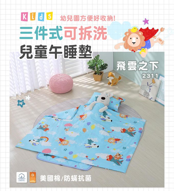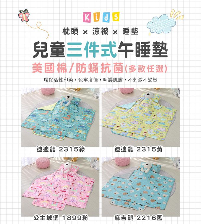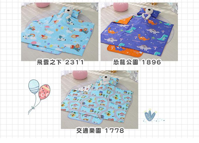 內容物:兒童睡墊1件+涼被 1件+枕芯 1件+枕套 1件