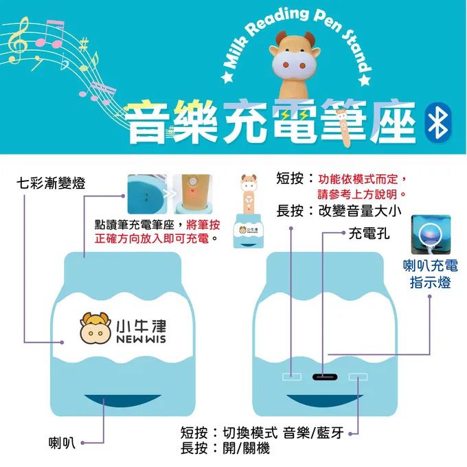 不僅如此,還有音樂充電筆座&充電(傳輸)線。別看藍色充電筆座小小一咖,功能可是非常多~(充電輸出建議使用5V/2A以下,請勿使用超過5V以上規格充電)