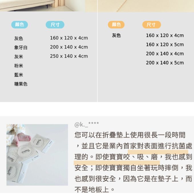 注意事項:1、收到地墊後,「請勿以尖銳物品割開紙箱或紙箱膠帶」(含美工刀、鑰匙、剪刀等),地墊容易被劃破。若出現此類行為,將視為人為破壞,無法退換貨。 2、因製作方式,地墊內層海綿可能出現±1公分的誤差,此為正常現象。 3、地墊雙面均可使用,為避免發霉,請視情況更換面使用,並在需要情況下開啟除濕機(發霉不在保固範圍中)。 4、請勿使用強烈酸性或鹼性清潔劑(酒精千萬別使用),這會導致產品顏色變化及破壞保護套表層。也勿使用易揮發清潔劑(如: 丙酮,空氣清新劑等)。 5、請勿使用蒸氣吸塵機,這會導致產品表層破壞。 6、請小心使用化學工具,如原子筆、永久性筆、顏色筆、蠟筆、油性筆、口紅、及指甲油,因為這些都很難擦掉。 7、如長時間被大型傢具壓住,表層可能不會彈回原狀。