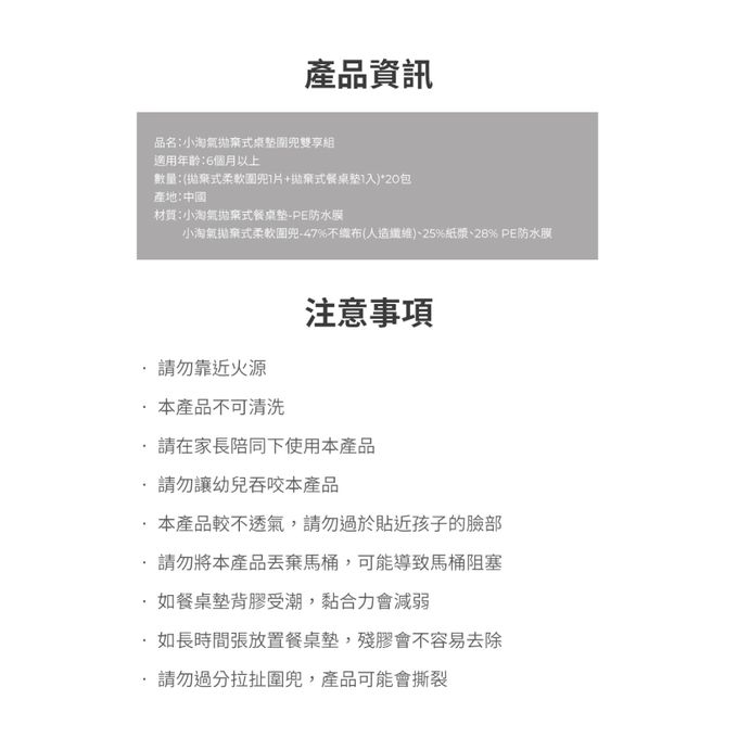 品名:小淘氣拋棄式餐桌墊圍兜雙享組