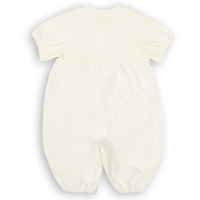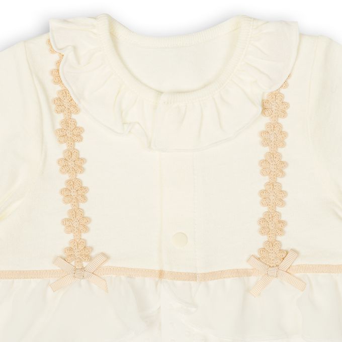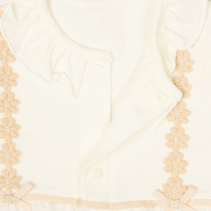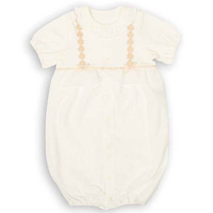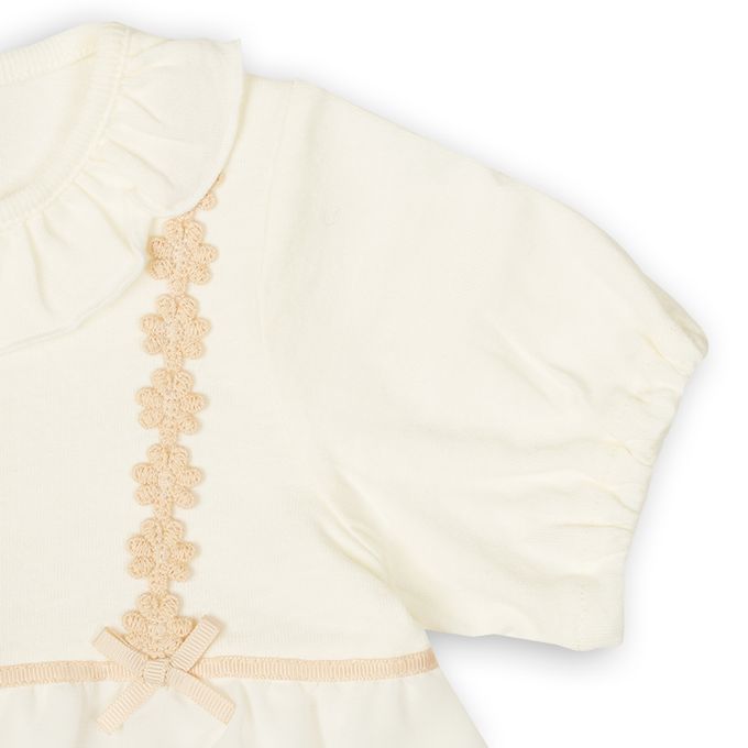 米白色款有蕾絲、蝴蝶結和雪紡裝飾