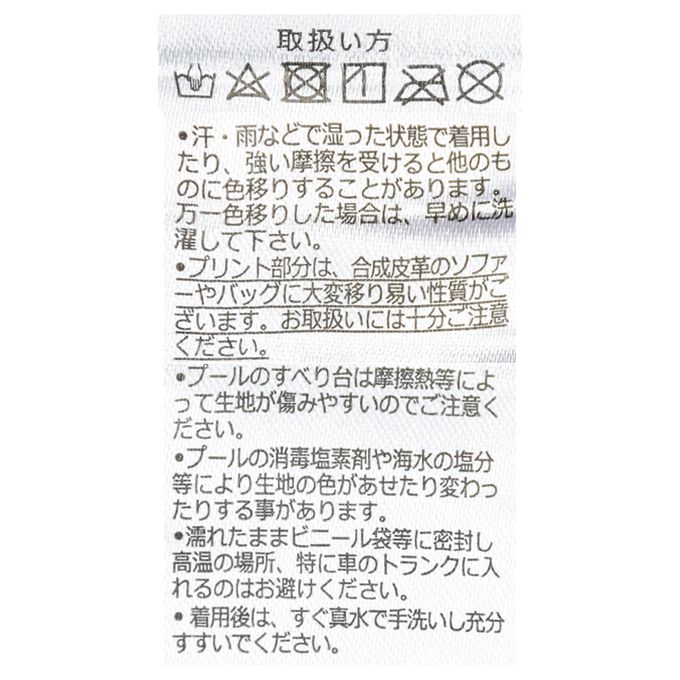 注意事項:●標示內容遵照台灣法規之規定。●請注意,有可能會因與岩石等粗糙面摩擦,或溜滑梯時造成起毛球情況。●長時間在游泳池等場所使用時,可能會因次氯酸類消毒水造成變色。●請勿在潮濕的狀態下長時間密封放置。●穿著後請盡快用清水洗滌。