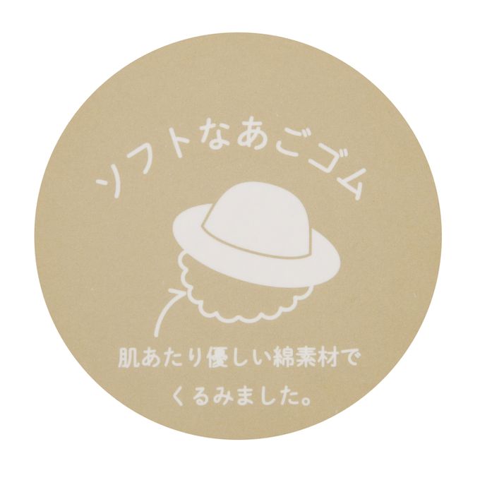 下巴有鬆緊帶可防止被風等吹落。下巴鬆緊帶用布料裹住,使膚觸更舒適。
