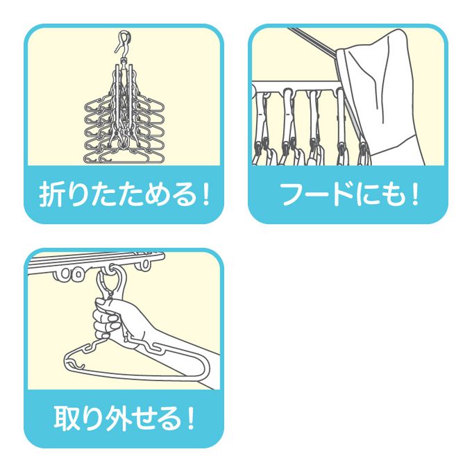 使用方式:①請展開本體。※開闔時請注意不要夾到手指。②請將主體中央的掛鉤(附握把)從本體中拉起。③握住掛鉤的握把,從主體的桿上解開。④將掛鉤朝上。⑤握住掛鉤的握把,將其掛在洗衣桿上。⑥請將掛有洗衣物的衣架平衡地掛在主體的孔洞部分。