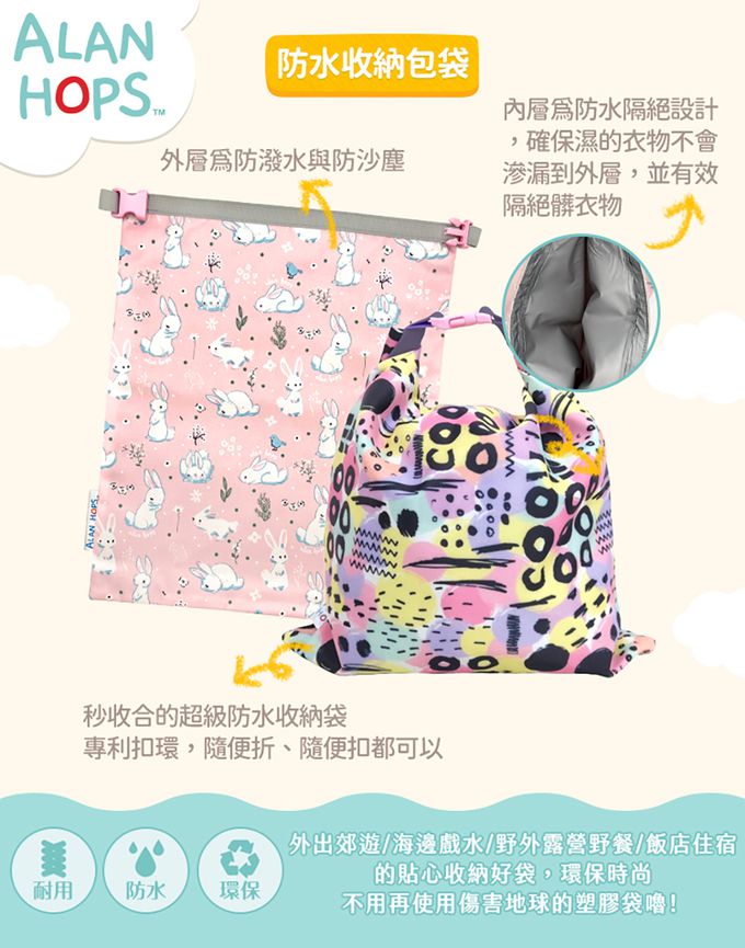 。秒收合的超級防水收納袋。專利扣環, 隨便折隨便扣都可以。完美收納空間, 尺寸約 32 x 40公分。內層為防水隔絕設計, 確保濕的衣物不會滲漏到外層, 並有效隔絕髒濕物。外層為防潑水與防沙塵。外出郊遊/海邊戲水/野外露營野餐/飯店住宿的貼心收納好袋, 環保時尚, 不用再使用傷害地球的塑膠袋嚕
