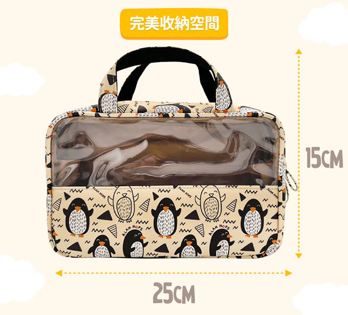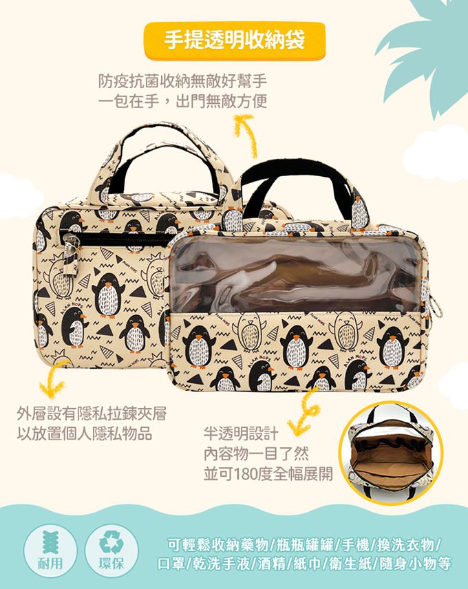 。防疫抗菌收納無敵好幫手。可輕鬆收納兒童藥物/瓶瓶罐罐/手機/換洗衣物/口罩/乾洗手液/酒精/紙巾/衛生紙/隨身小物等。一包在手, 出門無敵方便。半透明設計, 內容物一目了然, 並可180度全幅展開。外層設有隱私拉鍊夾層以放置個人隱私物品。尺寸為 25 x 15 x 5 公分注意事項:為避免損壞商品防水功能,請勿使用酒精、機洗、刷洗等方式清潔。如欲清潔商品,建議輕柔手洗或濕布擦拭、晾乾即可。