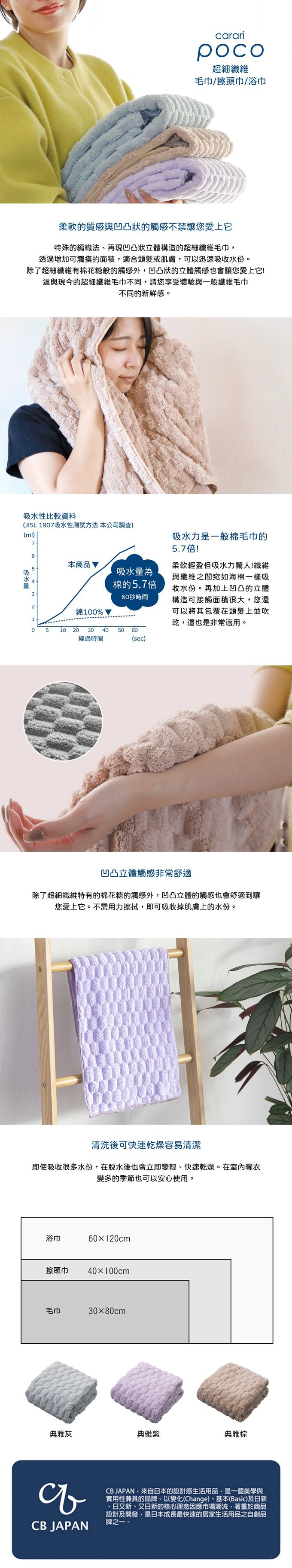 特殊的織法,凹凸格紋狀的舒適觸感,讓您情不自禁愛上使用它,吸水力為棉的5.7倍,即使輕柔,卻有驚人的吸水效果。何不體驗一下與一般纖維毛巾不同的新鮮感!