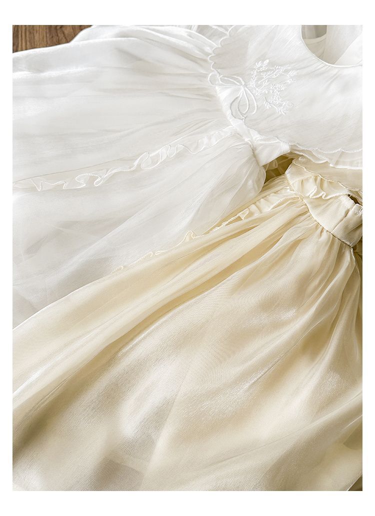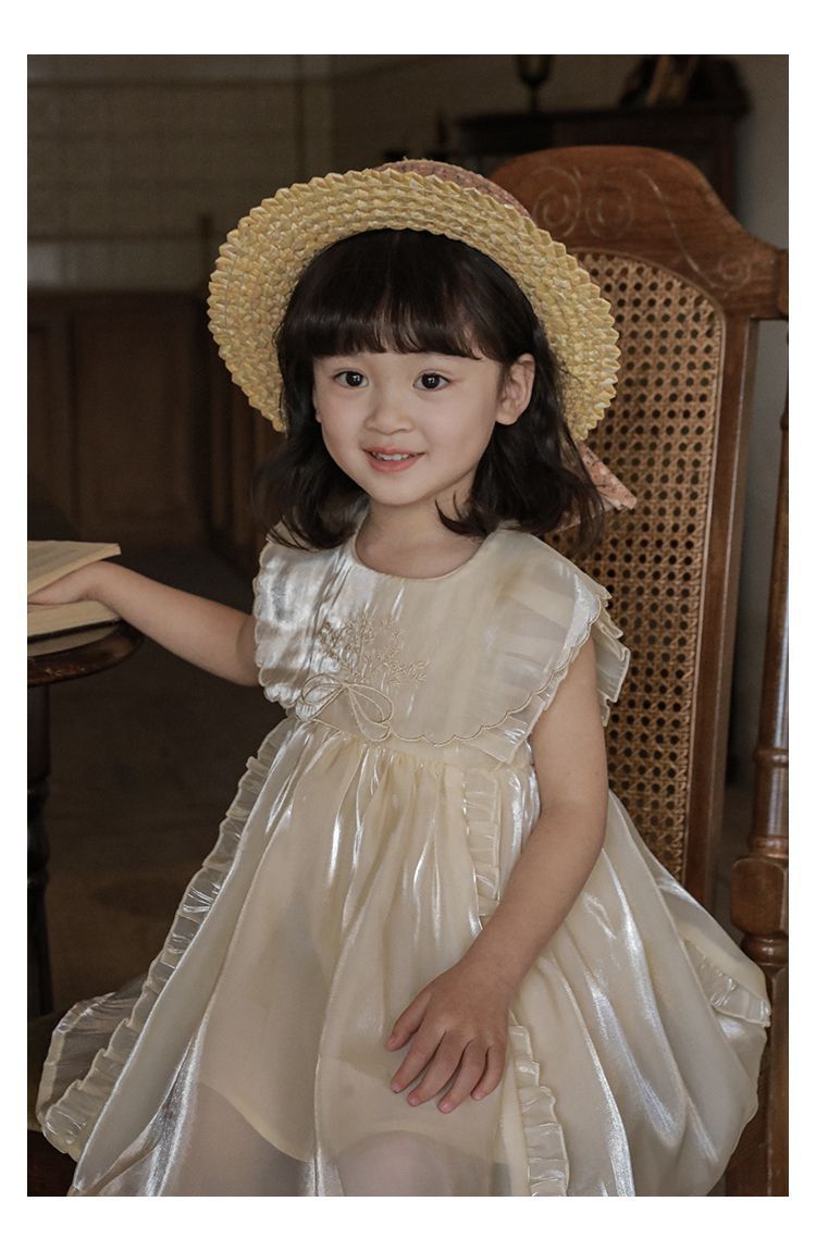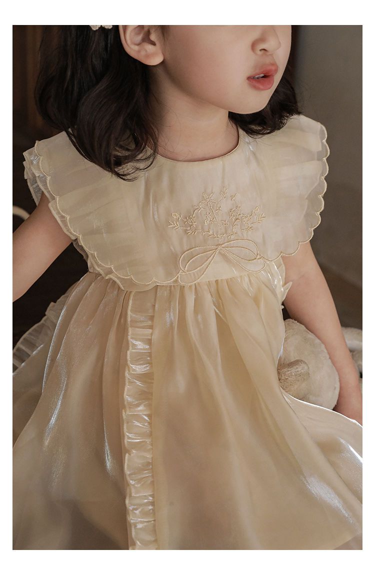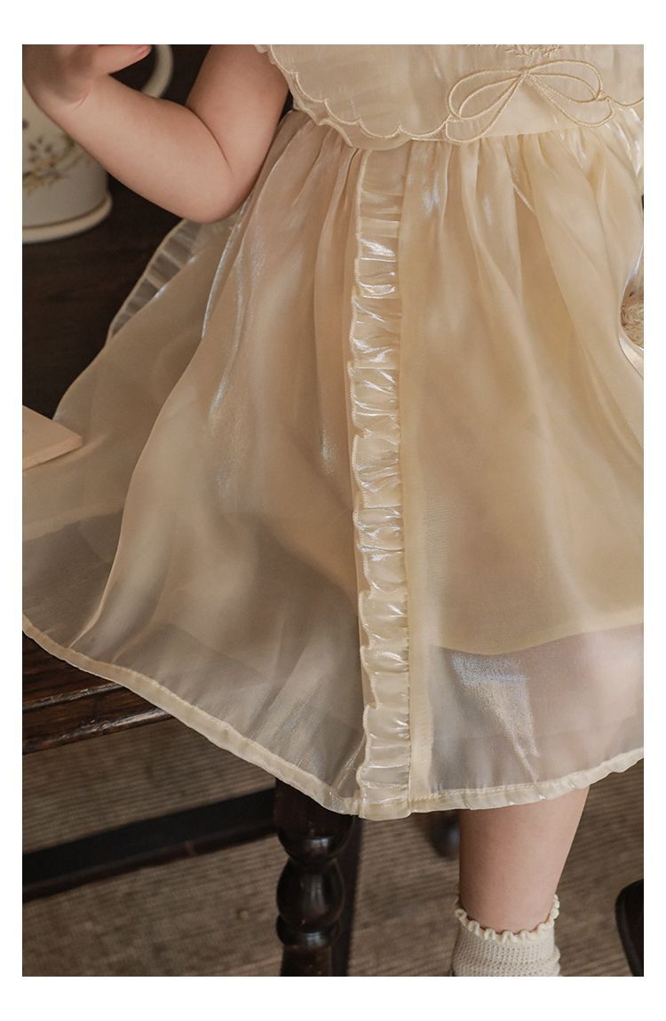 微光澤荷葉邊小飛袖網紗洋裝-杏色