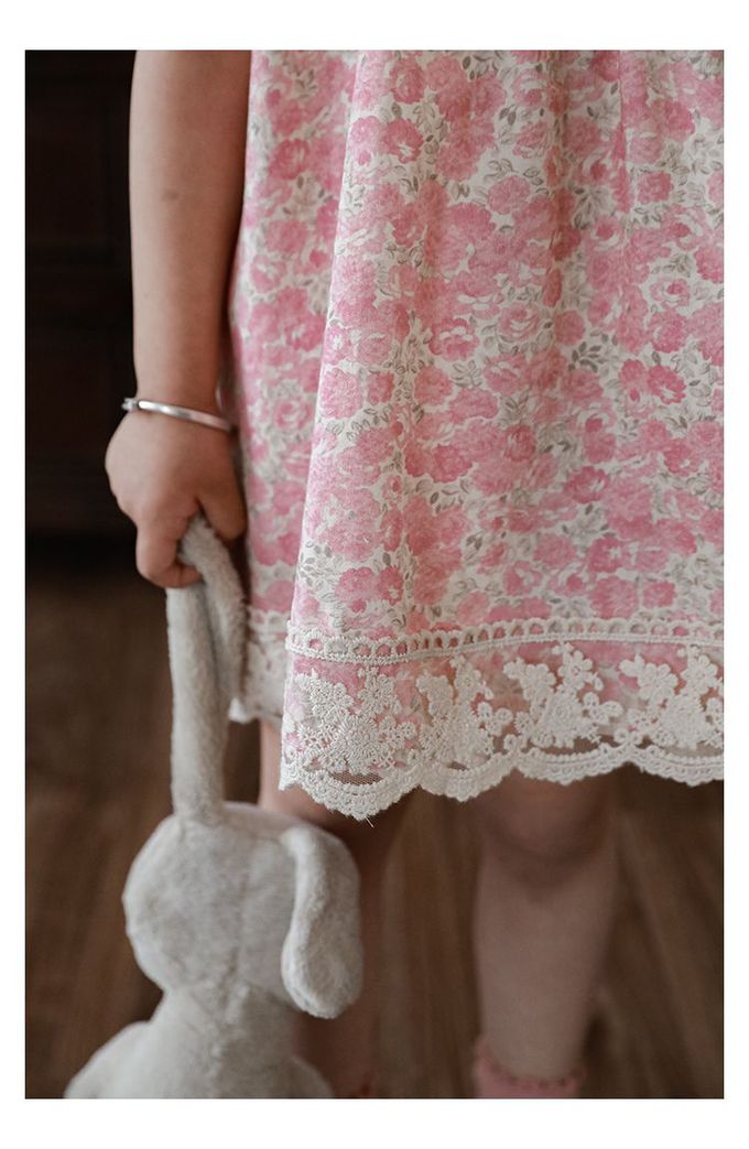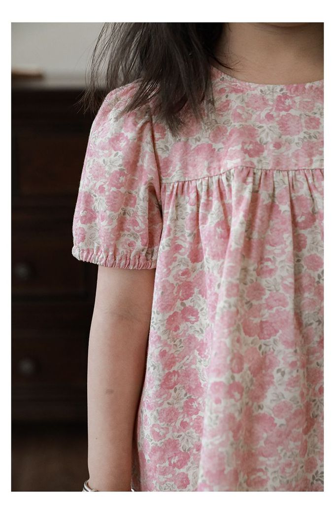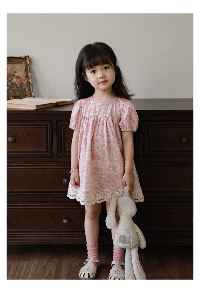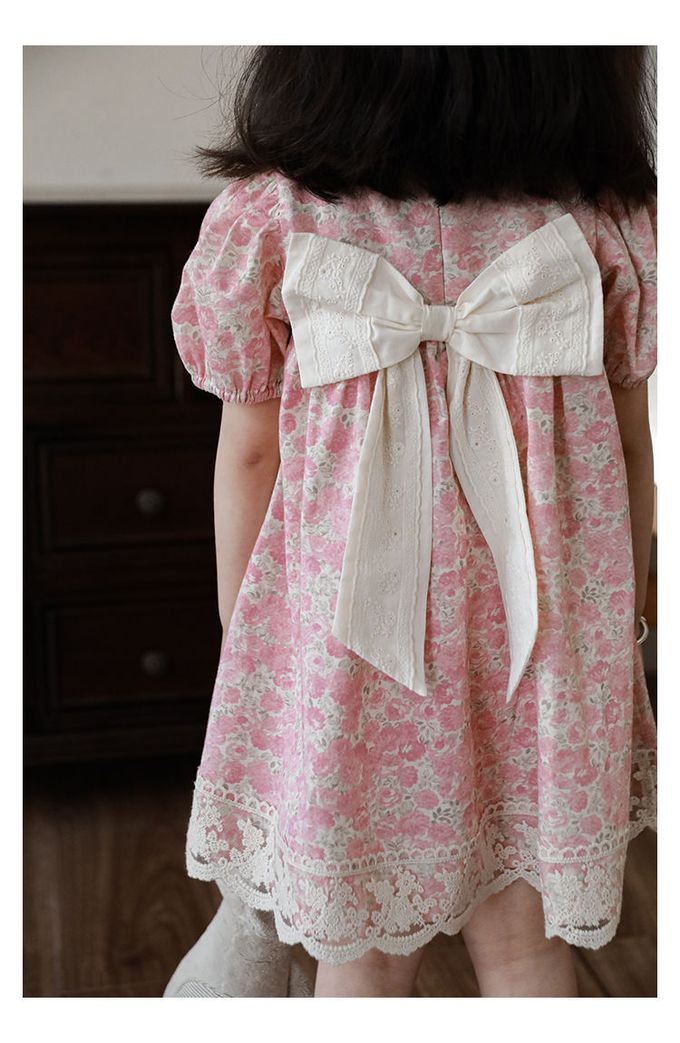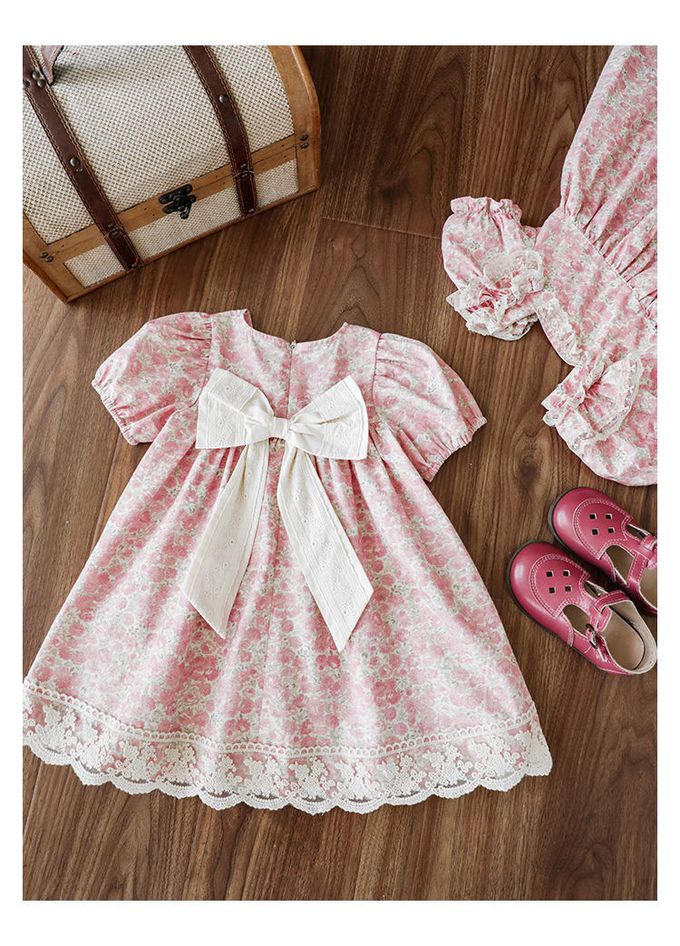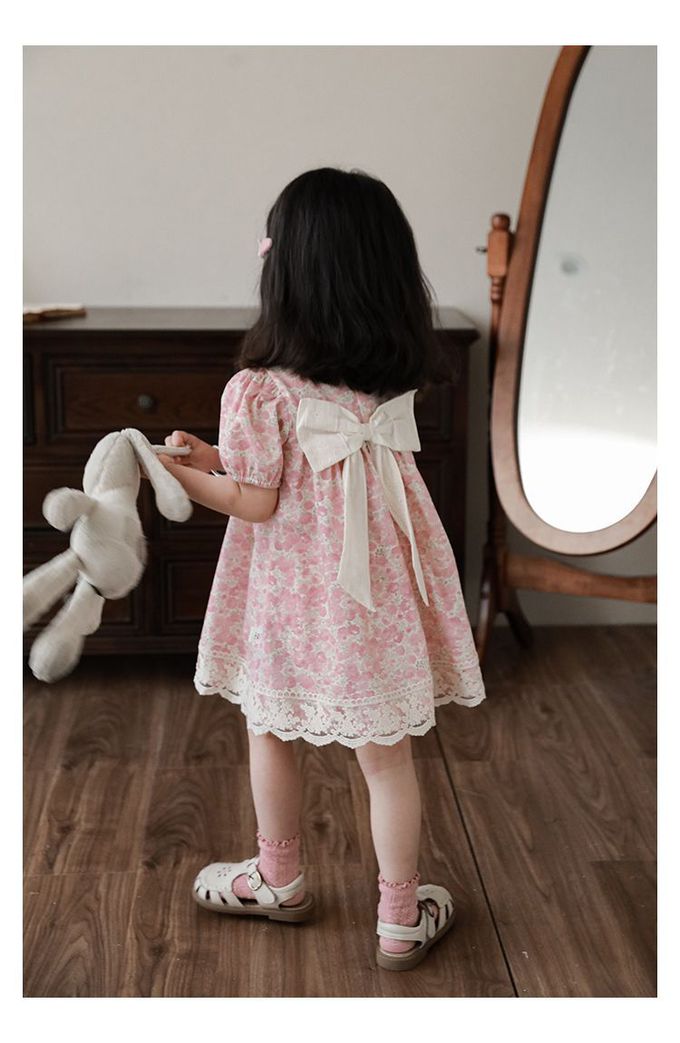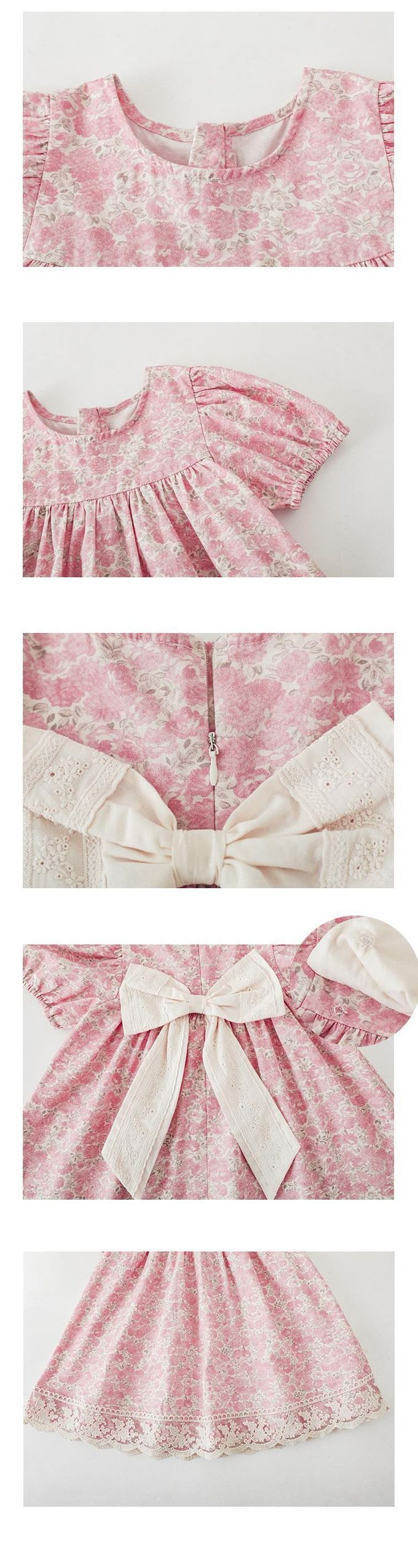 純棉蕾絲裙擺泡泡短袖洋裝-後蝴蝶結-粉色