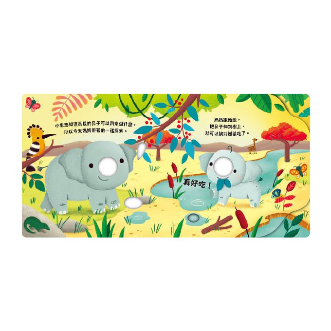 除了原有的書洞外,本書在外觀和內頁設計上具有巧思,書中設計形狀凹槽,讓孩子動動小手,觸摸書中的凹槽。另外,頁面設計也使用不規則的波浪線條裁切,沿著路徑畫出線條,可以提升孩子手指、手腕的靈活度以及運筆能力,促進手眼發展更協調。
