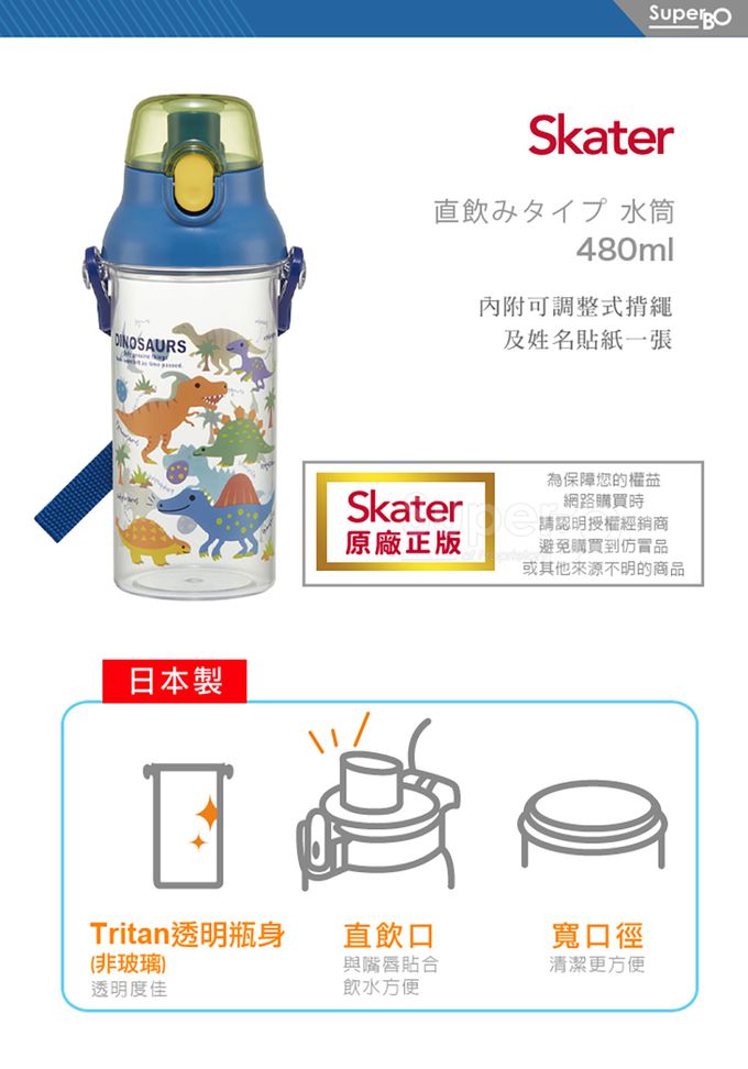 日本 SKATER - (兒童)直飲式透明水壺-恐龍圖鑑-480ml