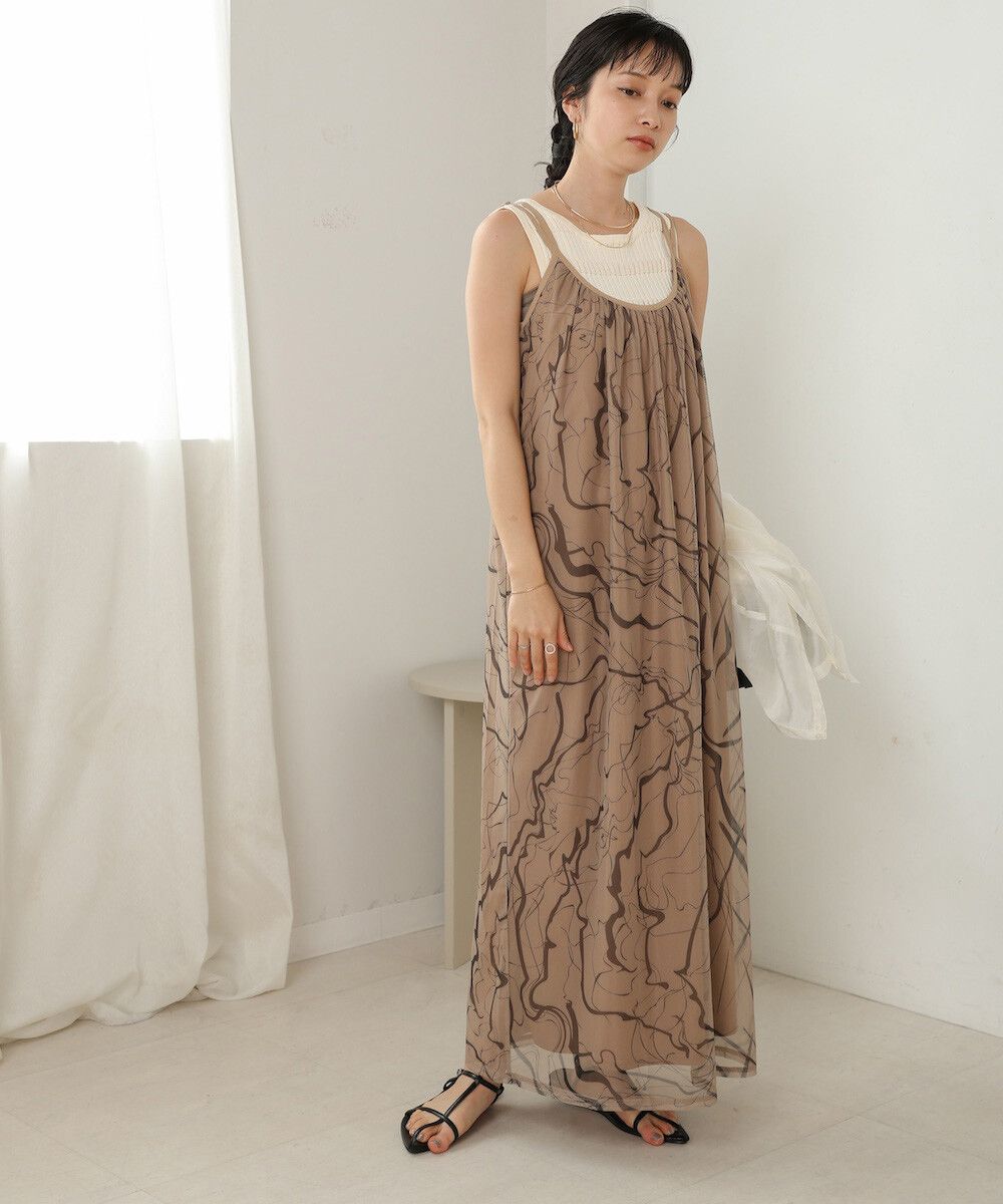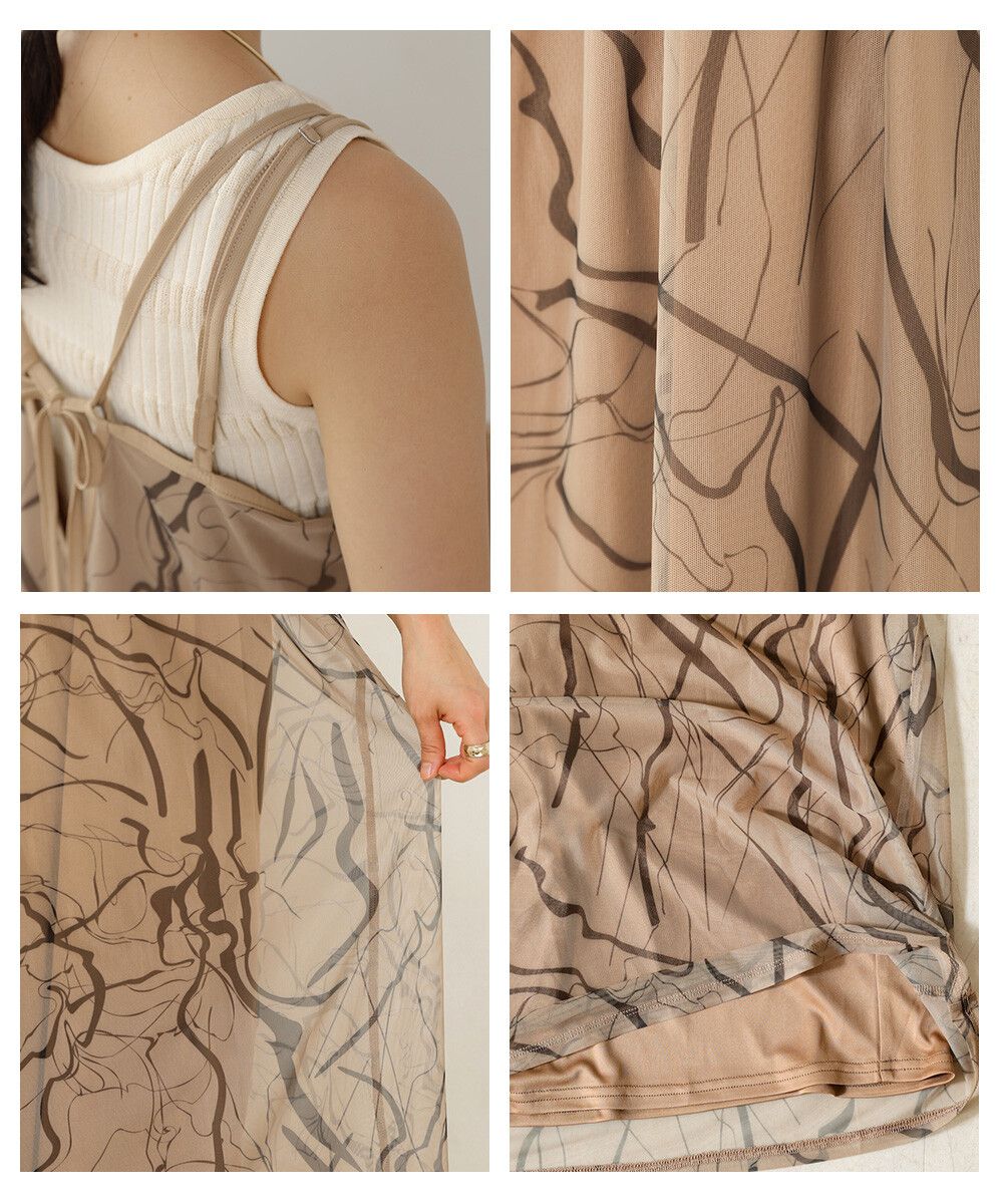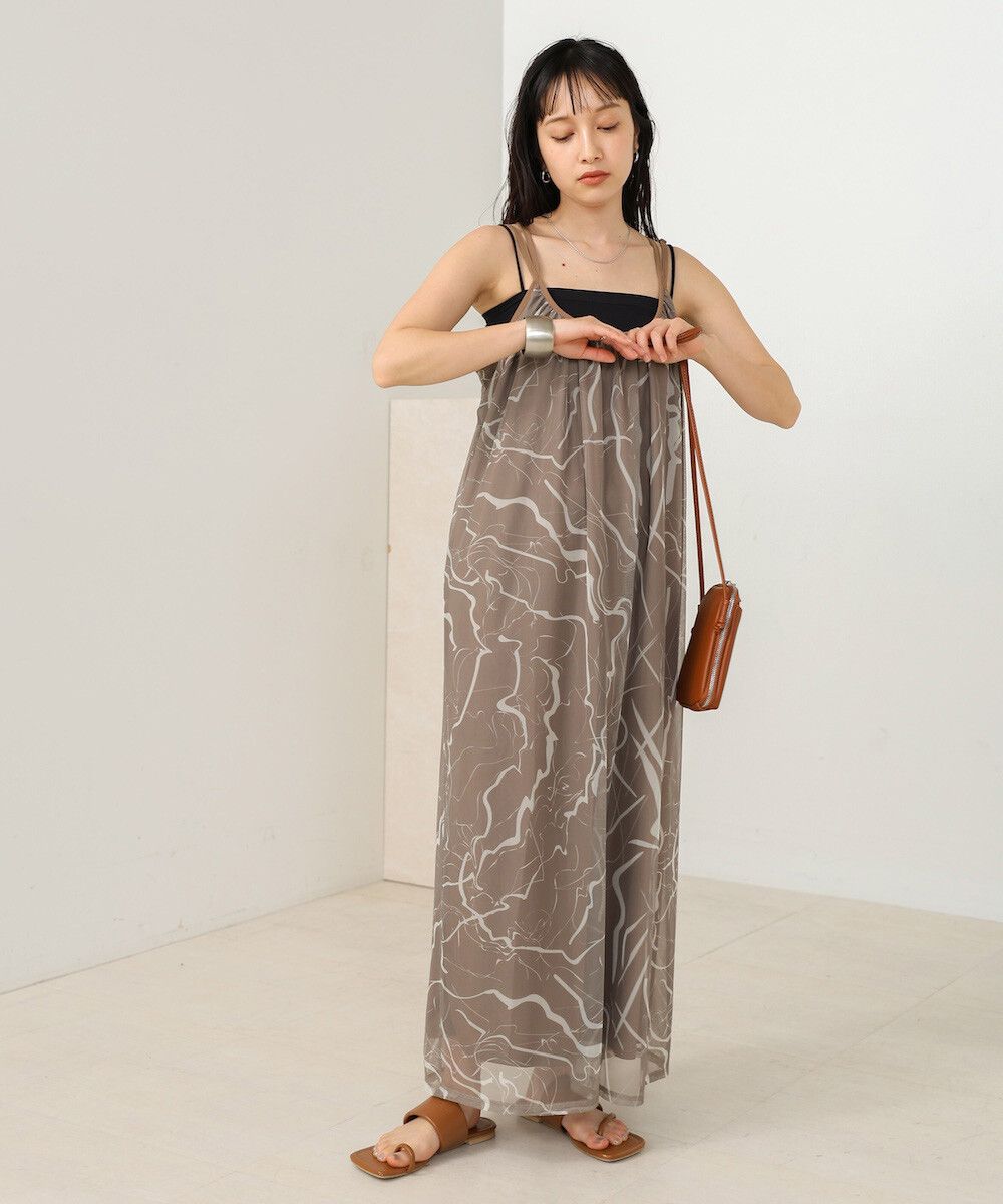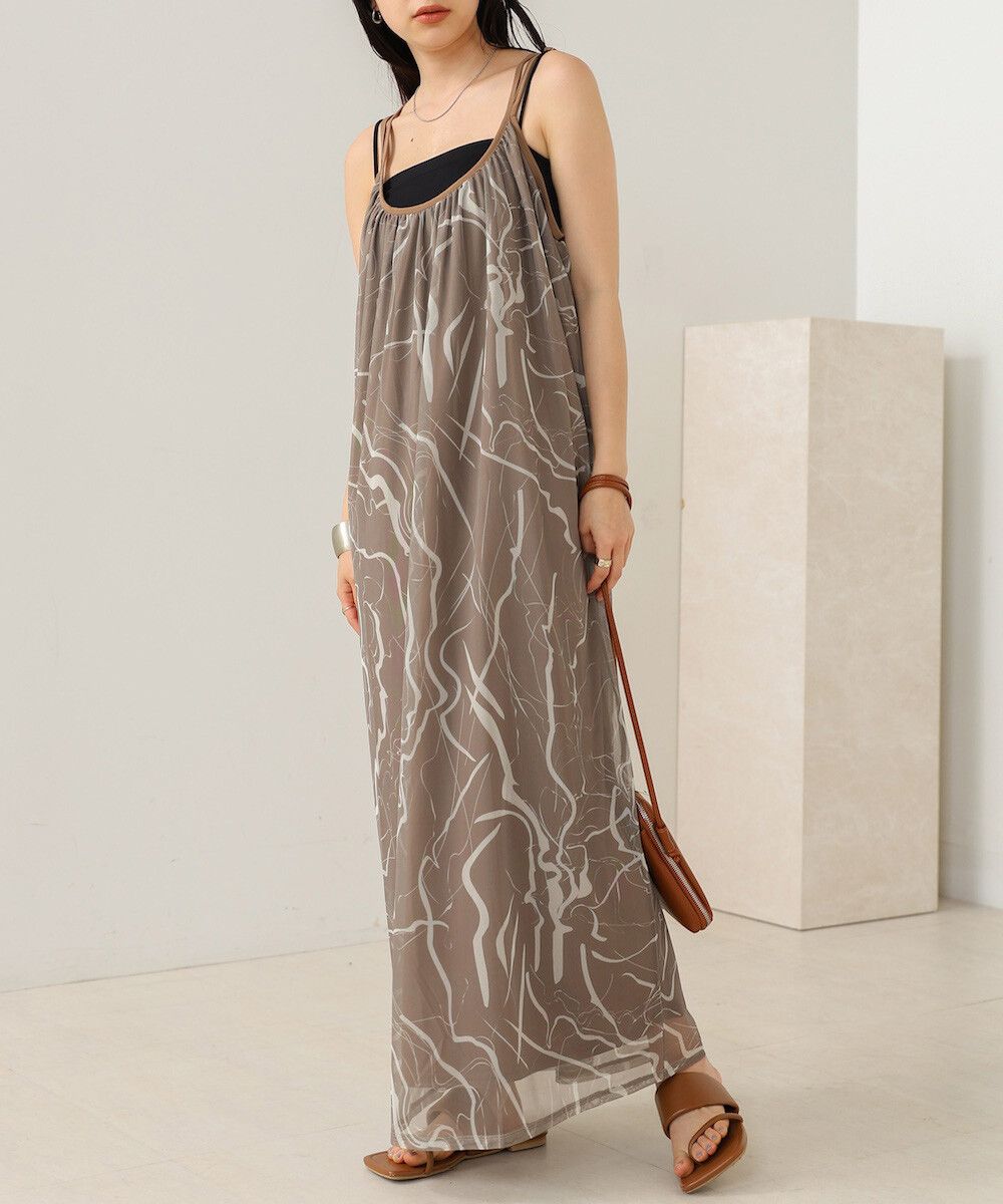 大理石印花雙層薄紗細肩帶洋裝