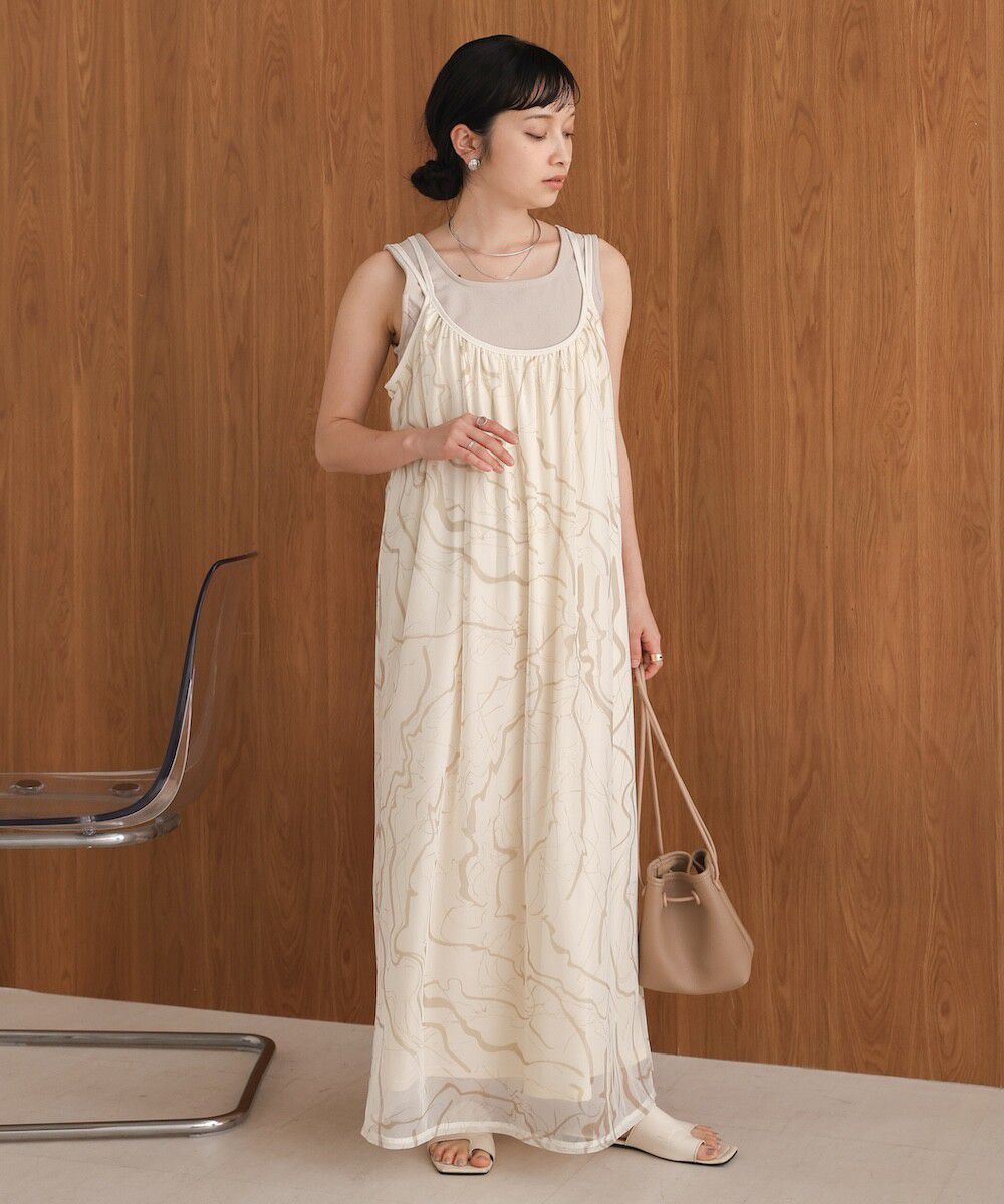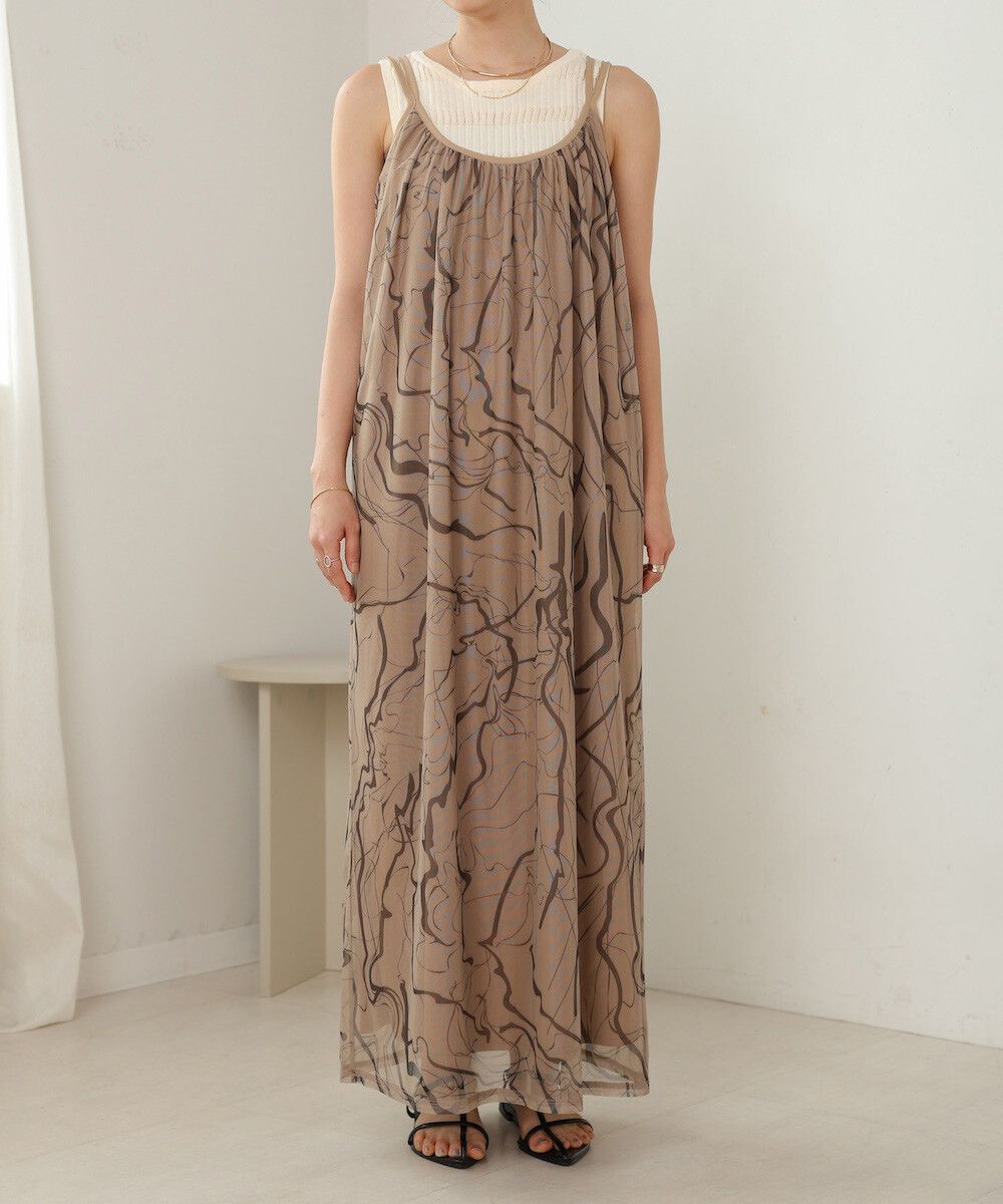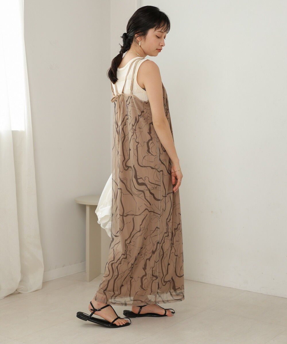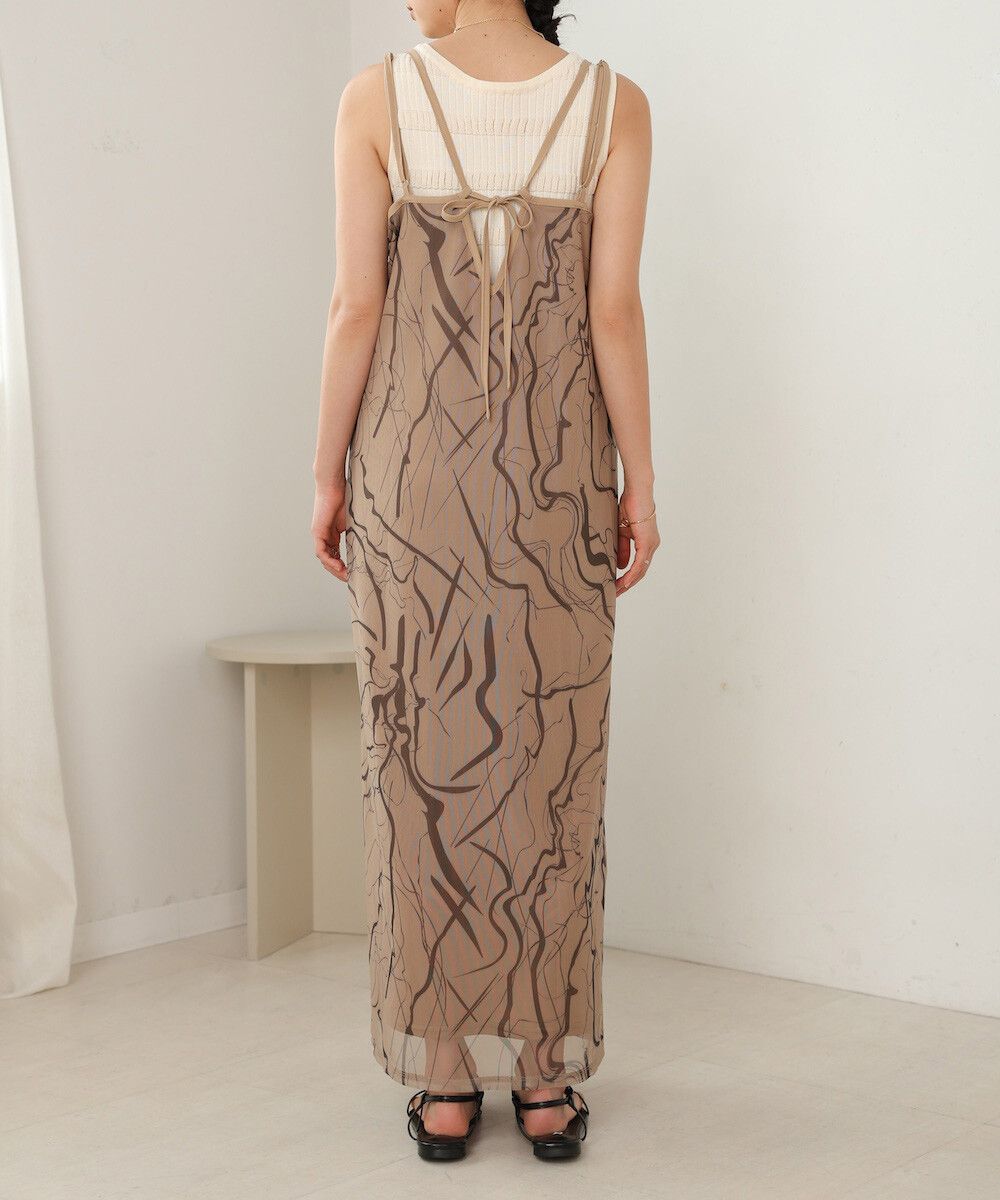 大理石印花雙層薄紗細肩帶洋裝