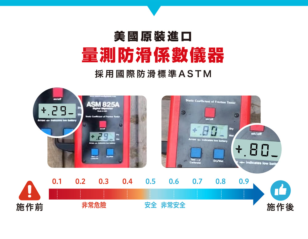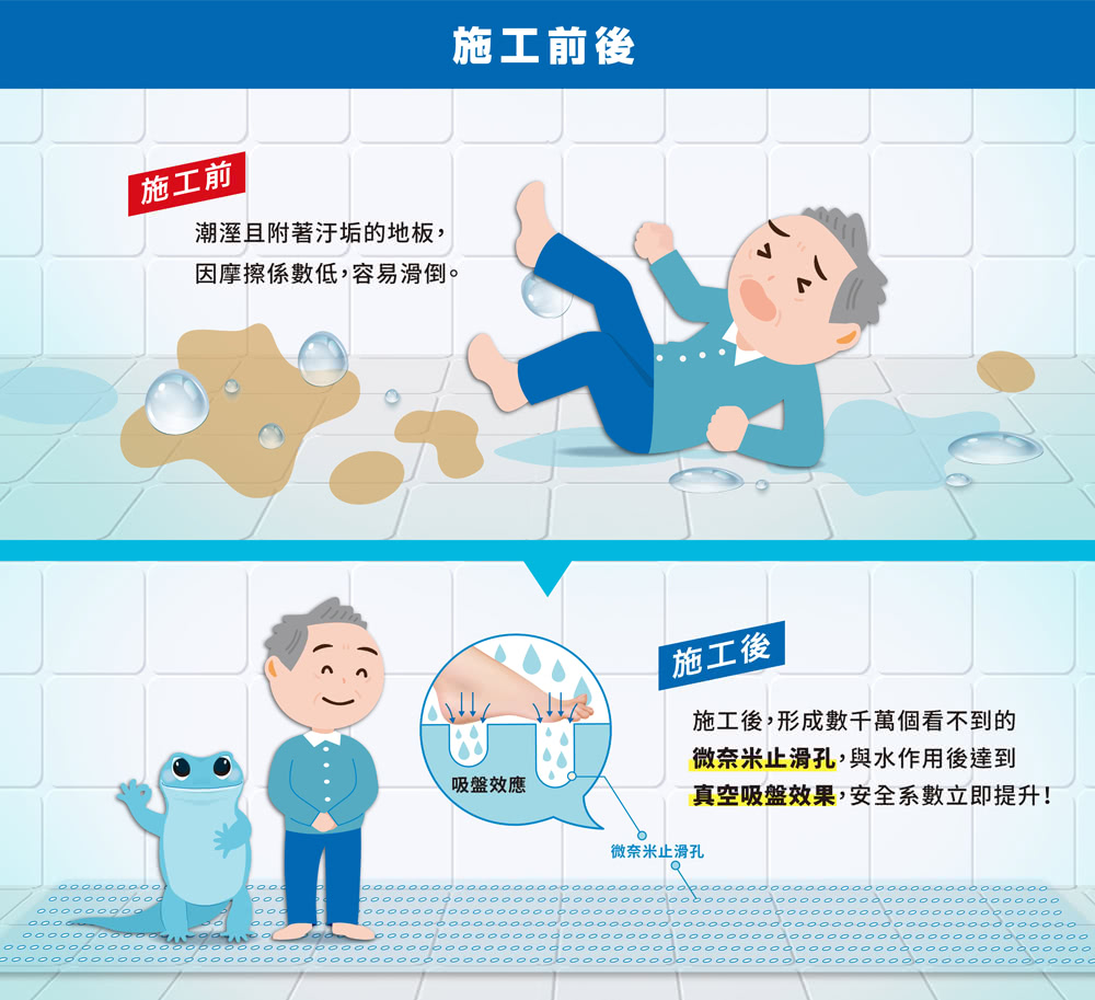 保養清潔劑每個月定期使用一次,使原施作防滑處能更完整延續防滑效果,