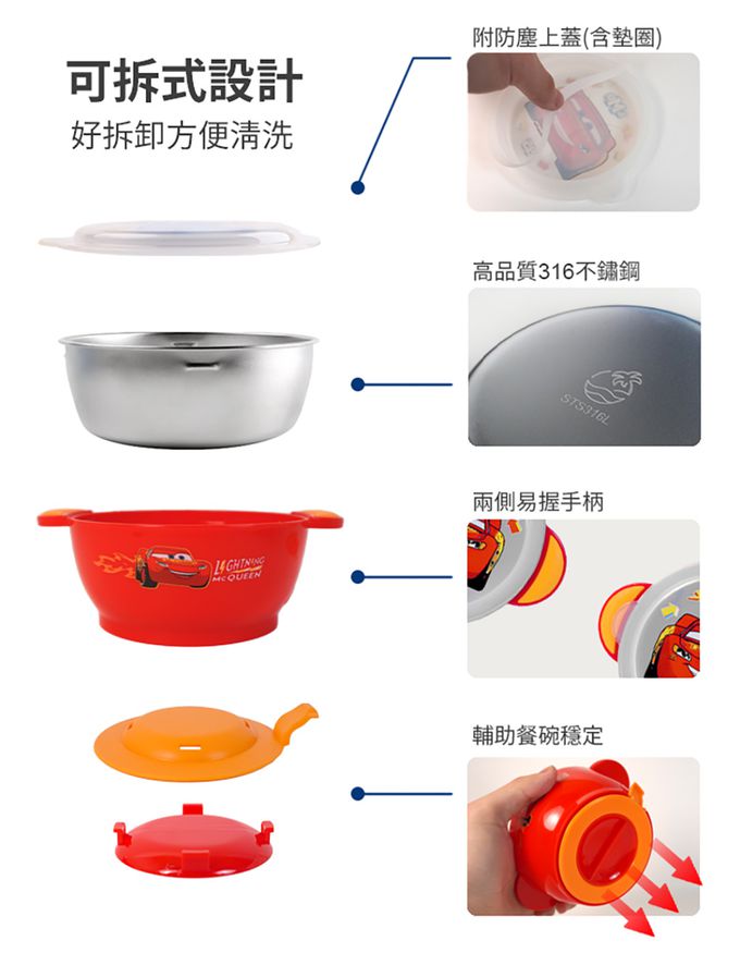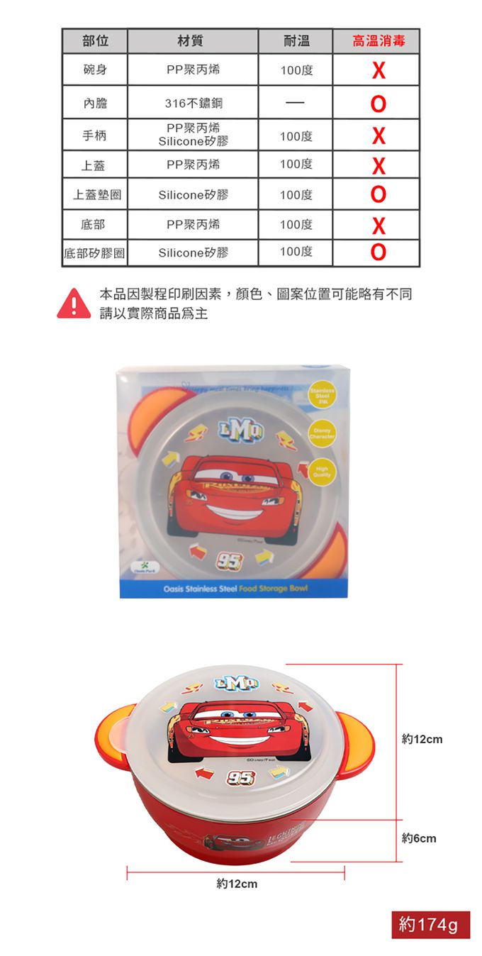 注意事項:●不鏽鋼內膽可單獨拆卸高溫消毒。碗身請勿使用洗碗機、消毒鍋及煮沸等方式消毒,可能會導致產品變形或圖案剝落。 ●不鏽鋼製品請勿使用微波爐加熱。 ●底部矽膠僅為輔助餐碗穩定,非吸附功能。 ●本品無防漏,請勿橫置或劇烈搖晃避免內容物溢出。 ●不鏽鋼製程中產生細微刮壓痕均屬正常現象。 ●請以柔軟海綿清洗,勿使用鋼刷等硬質物洗滌避免產品刮傷。 ●請在成人看護下使用。