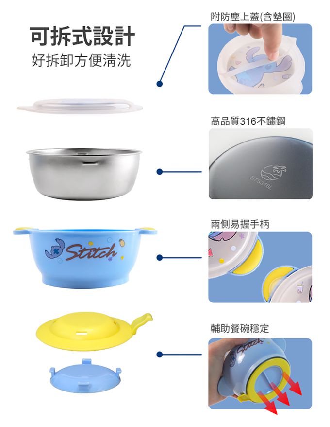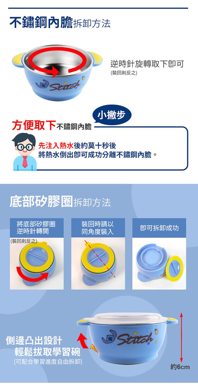 注意事項:●不鏽鋼內膽可單獨拆卸高溫消毒。碗身請勿使用洗碗機、消毒鍋及煮沸等方式消毒,可能會導致產品變形或圖案剝落。 ●不鏽鋼製品請勿使用微波爐加熱。 ●底部矽膠僅為輔助餐碗穩定,非吸附功能。 ●本品無防漏,請勿橫置或劇烈搖晃避免內容物溢出。 ●不鏽鋼製程中產生細微刮壓痕均屬正常現象。 ●請以柔軟海綿清洗,勿使用鋼刷等硬質物洗滌避免產品刮傷。 ●請在成人看護下使用。