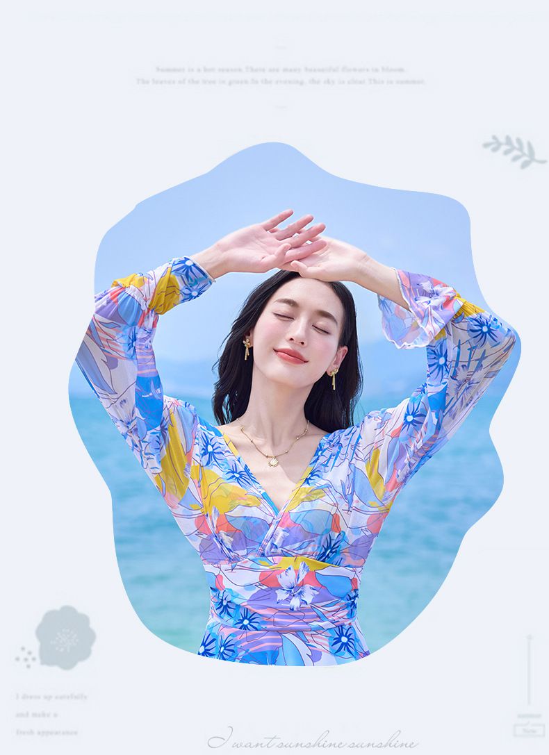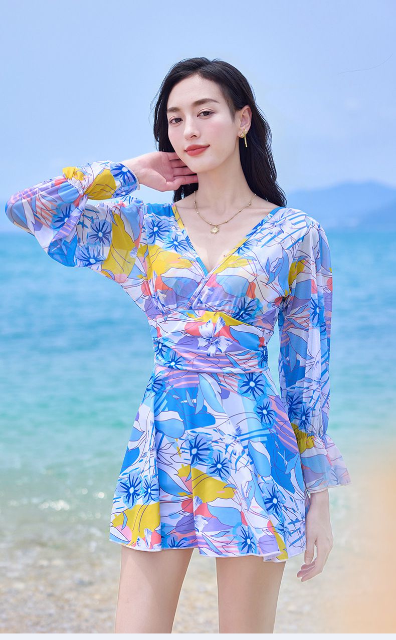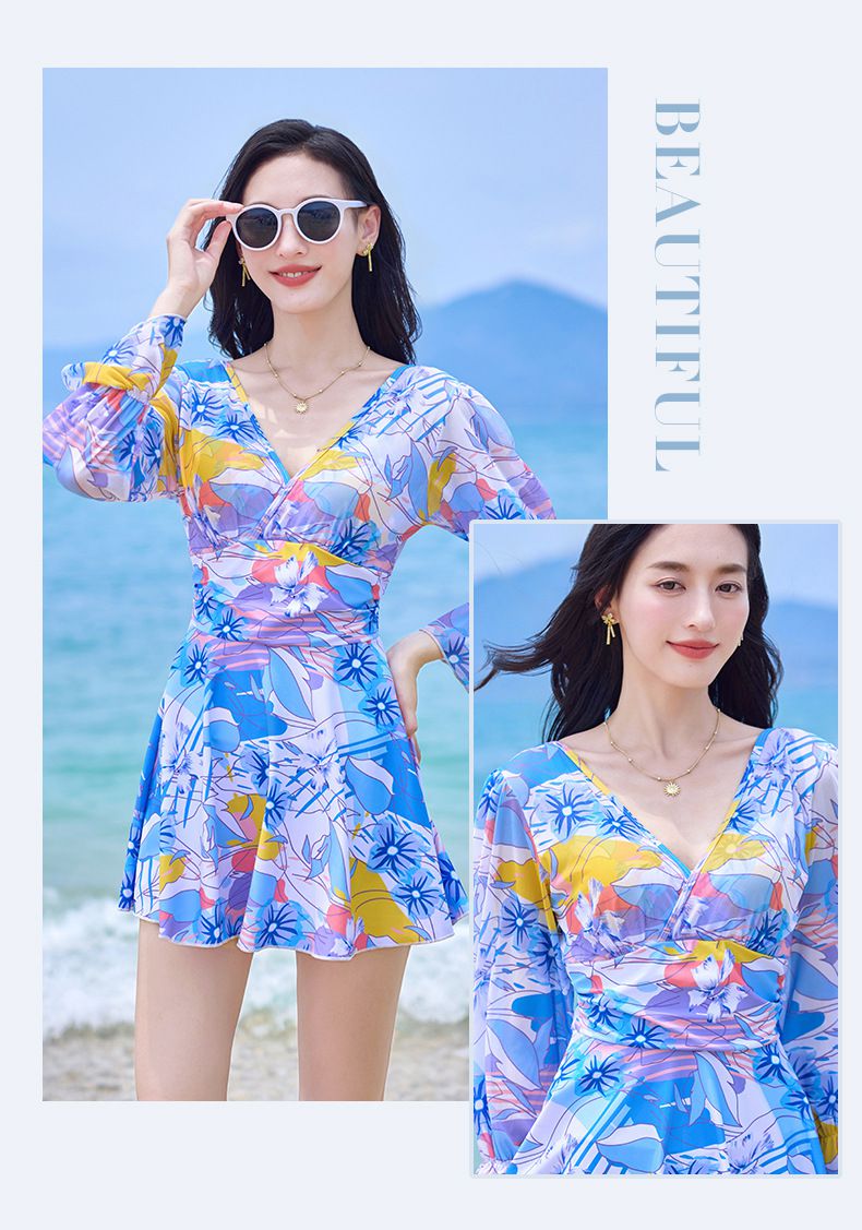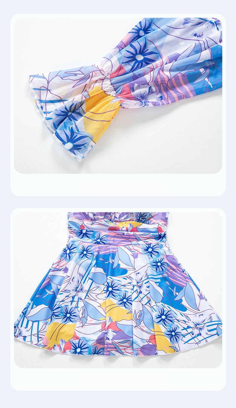 V領防曬荷葉袖連身裙泳衣-湛藍花卉