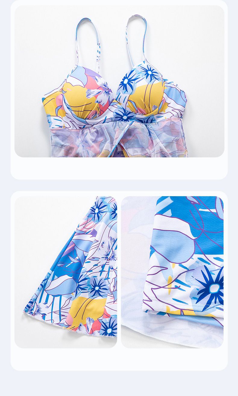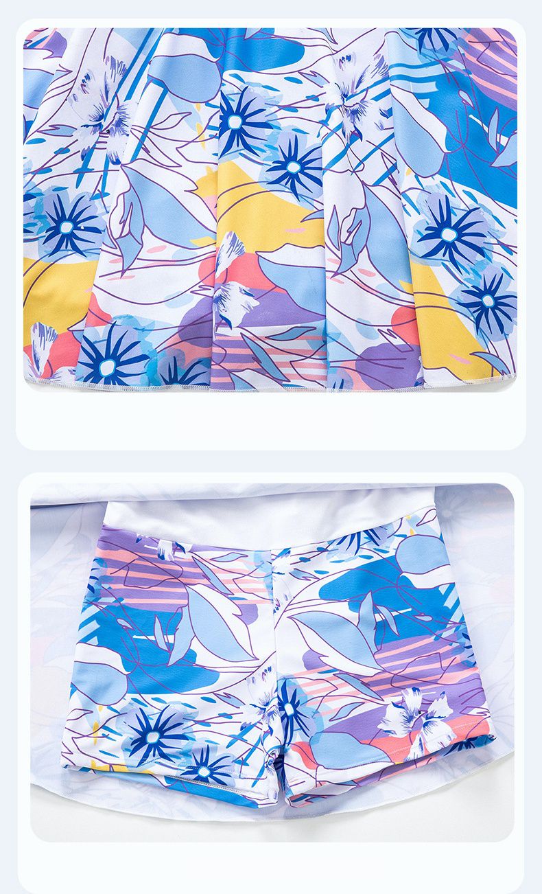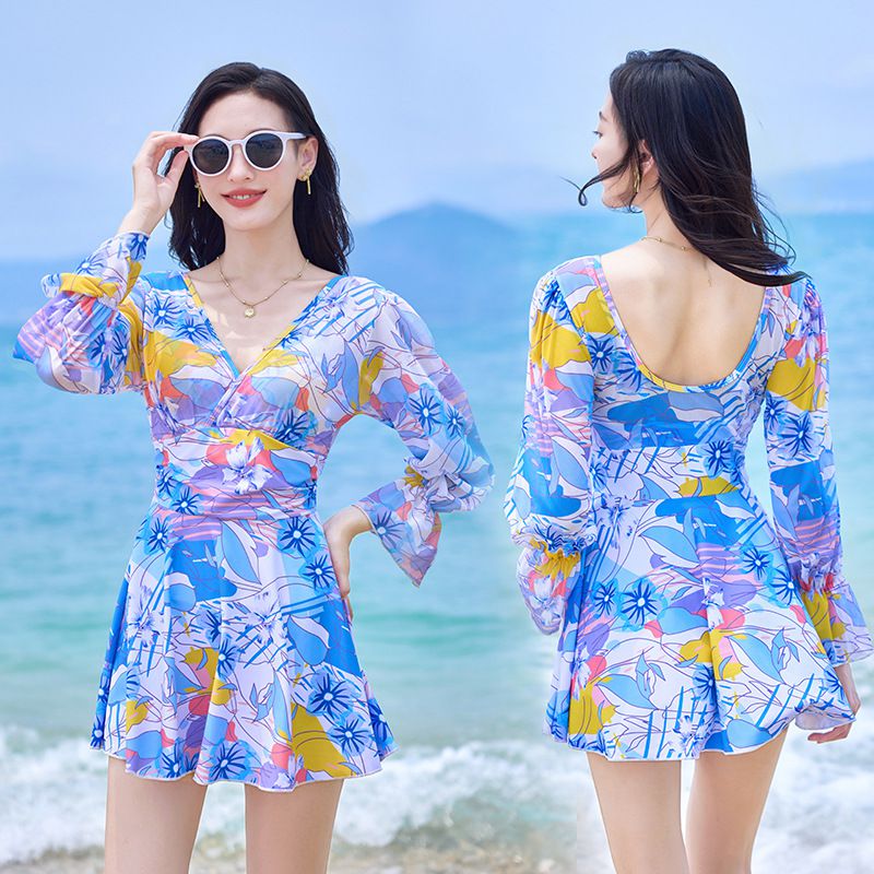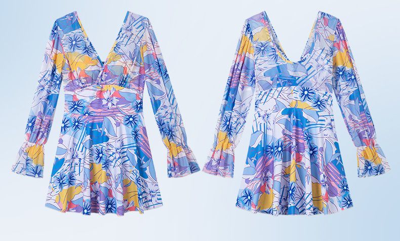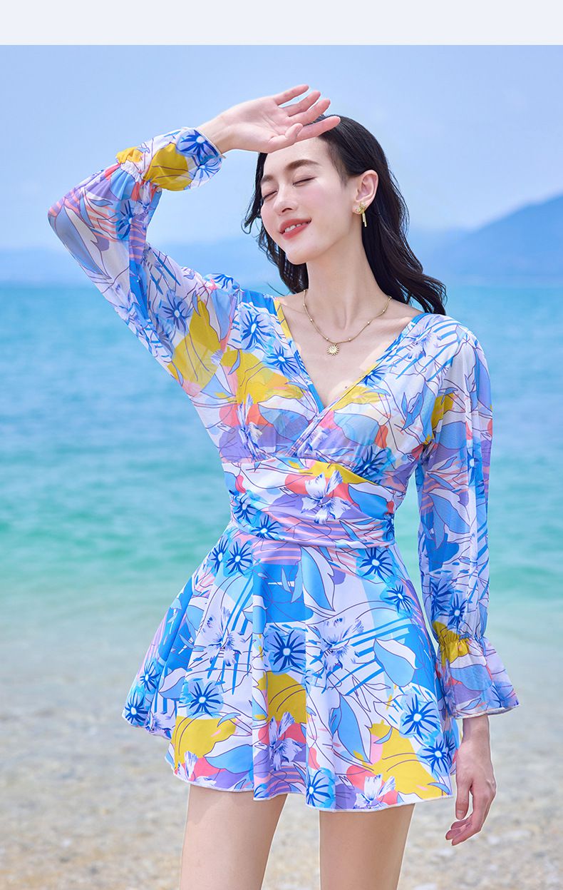 V領防曬荷葉袖連身裙泳衣-湛藍花卉