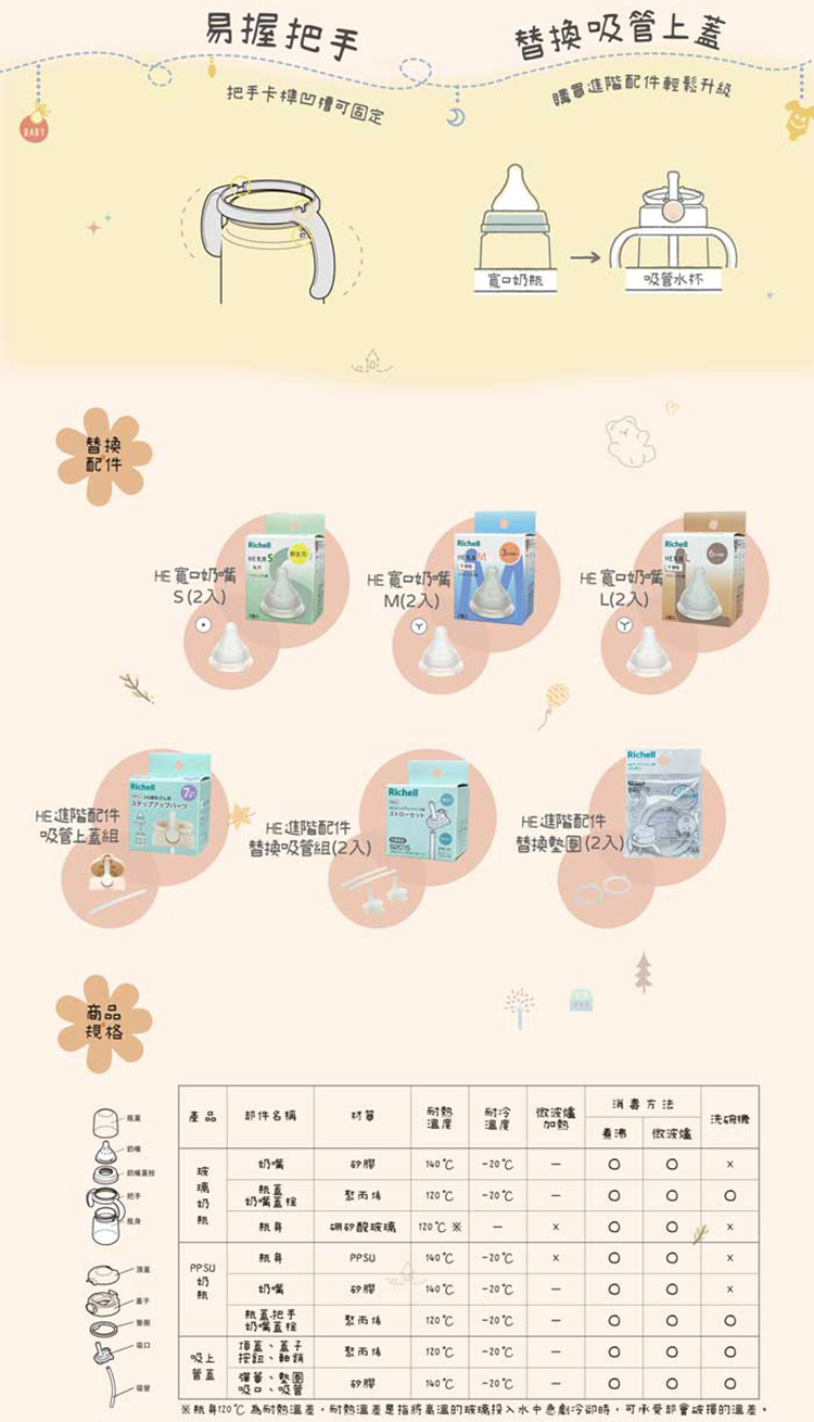 ● Hanaemi 系列寬口玻璃哺乳奶瓶● 平衡內外氣壓預防脹氣● 透明度瓶身,容量刻度看的見● 猶如親乳般的服貼 適合寶寶吸允的柔韌度● 零件少 易拆卸好清潔● 奶嘴 配件 購買替換好方便 ● 適用年齡 0 個月以上
