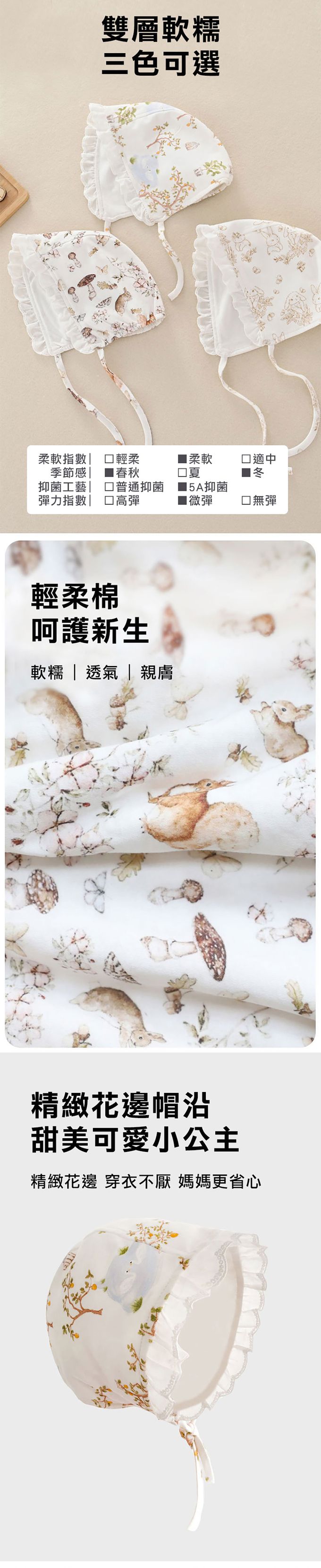 2入-新生兒蕾絲公主胎帽 綁帶嬰兒帽-森林松鼠+隨機一入 (適戴頭圍約36-48cm)