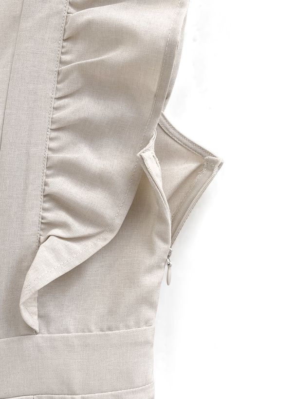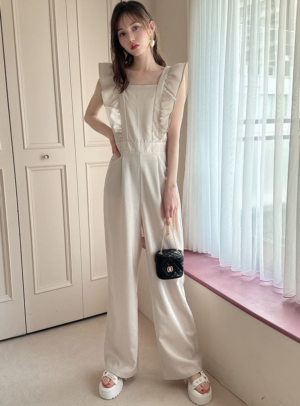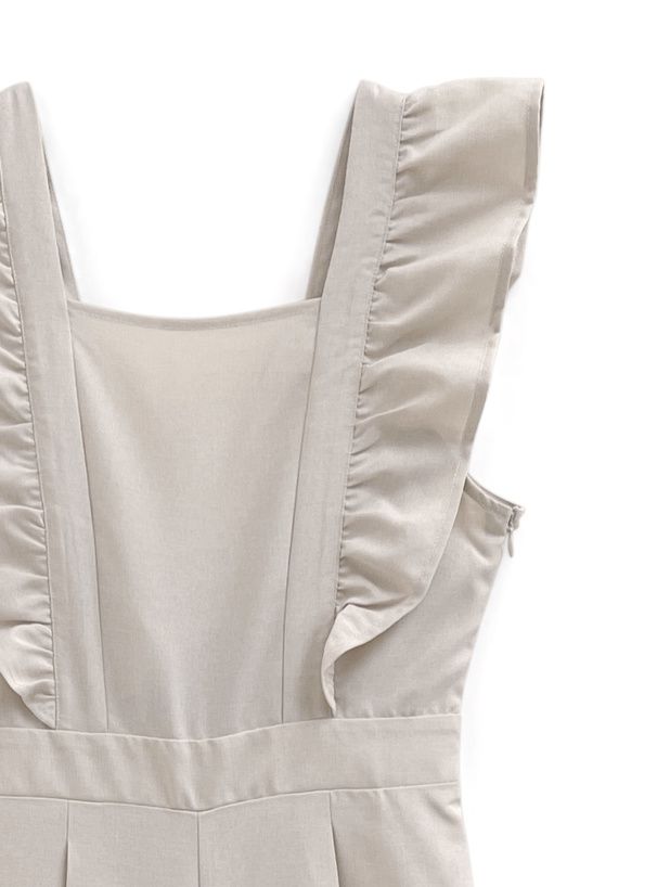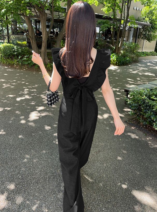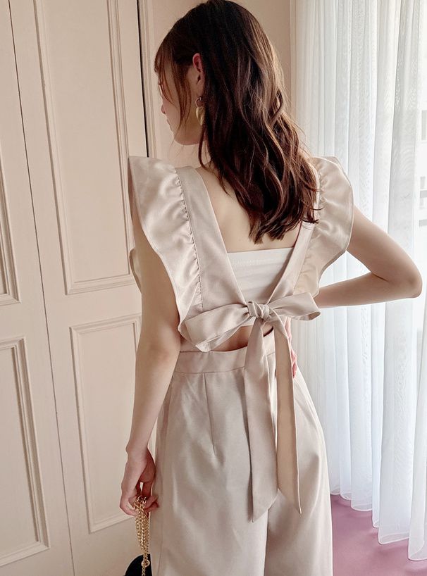 • 品名:甜美荷葉露腰後綁帶連身褲