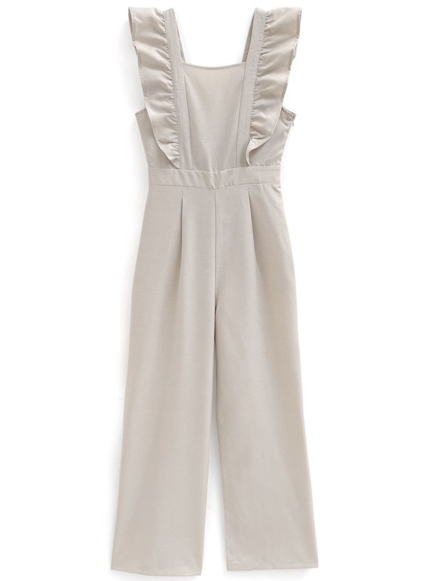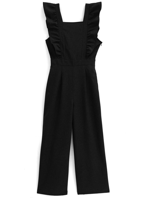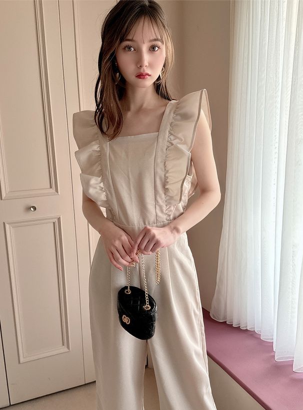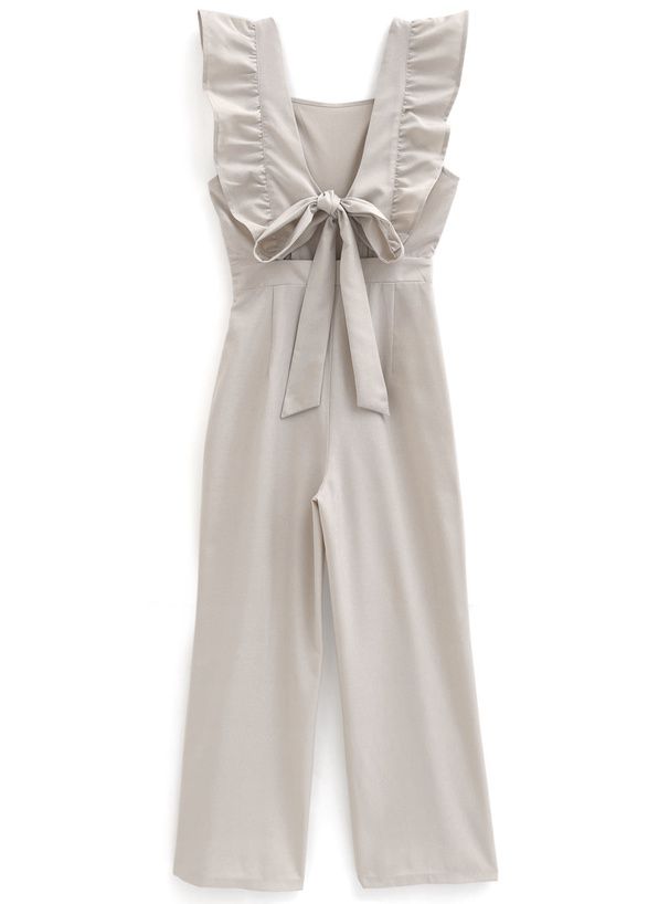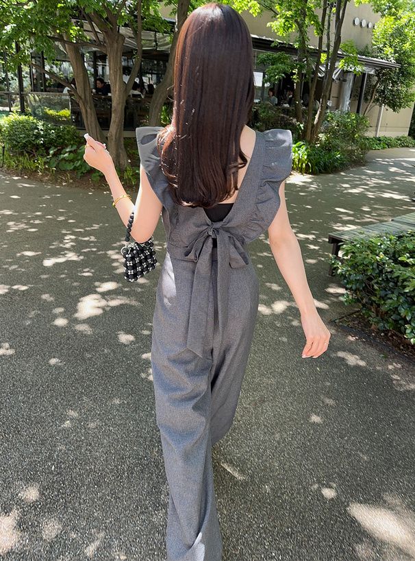 日本 GRL - 甜美荷葉露腰後綁帶連身褲-炭灰