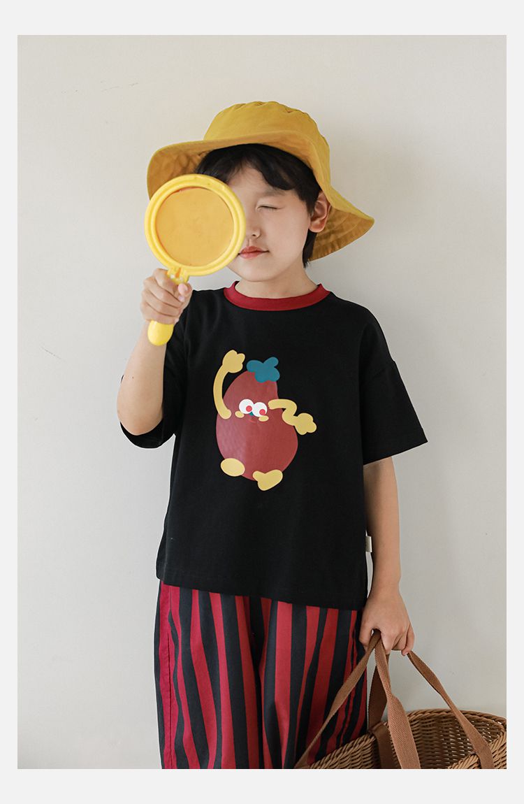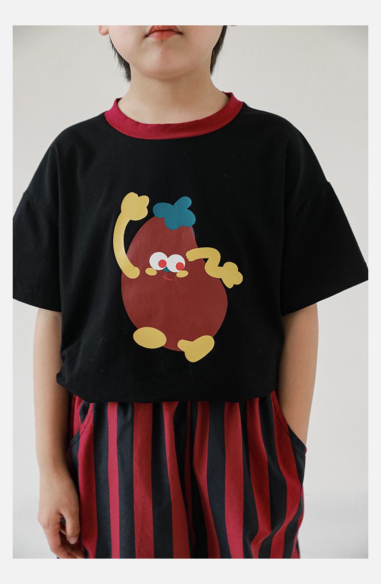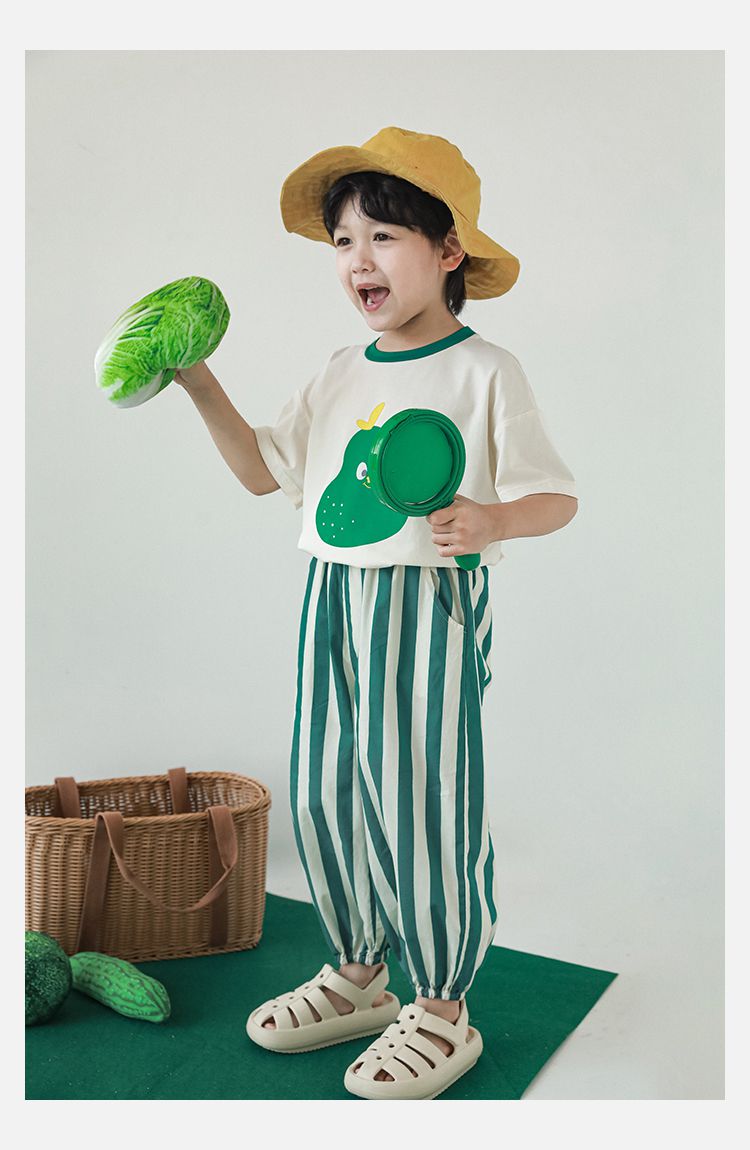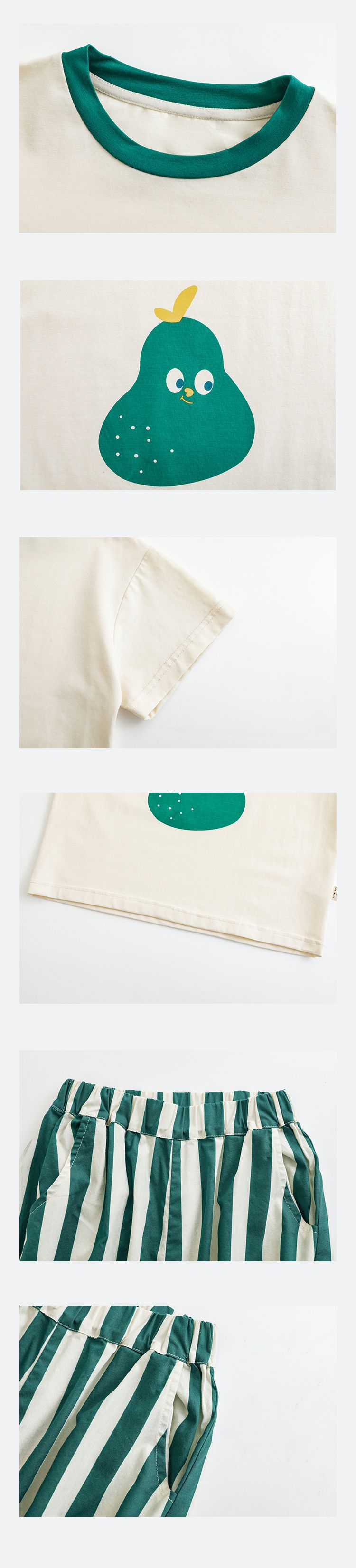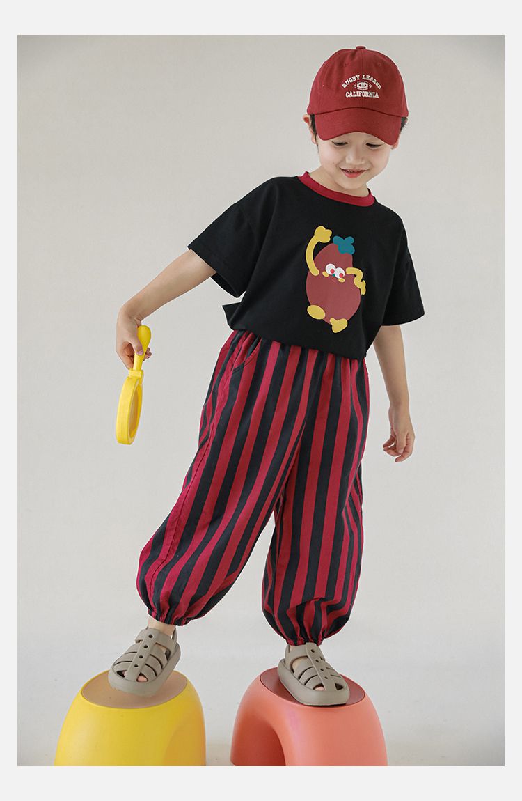 撞色圓領短袖上衣+條紋長褲套裝-蔬果派對-黑色