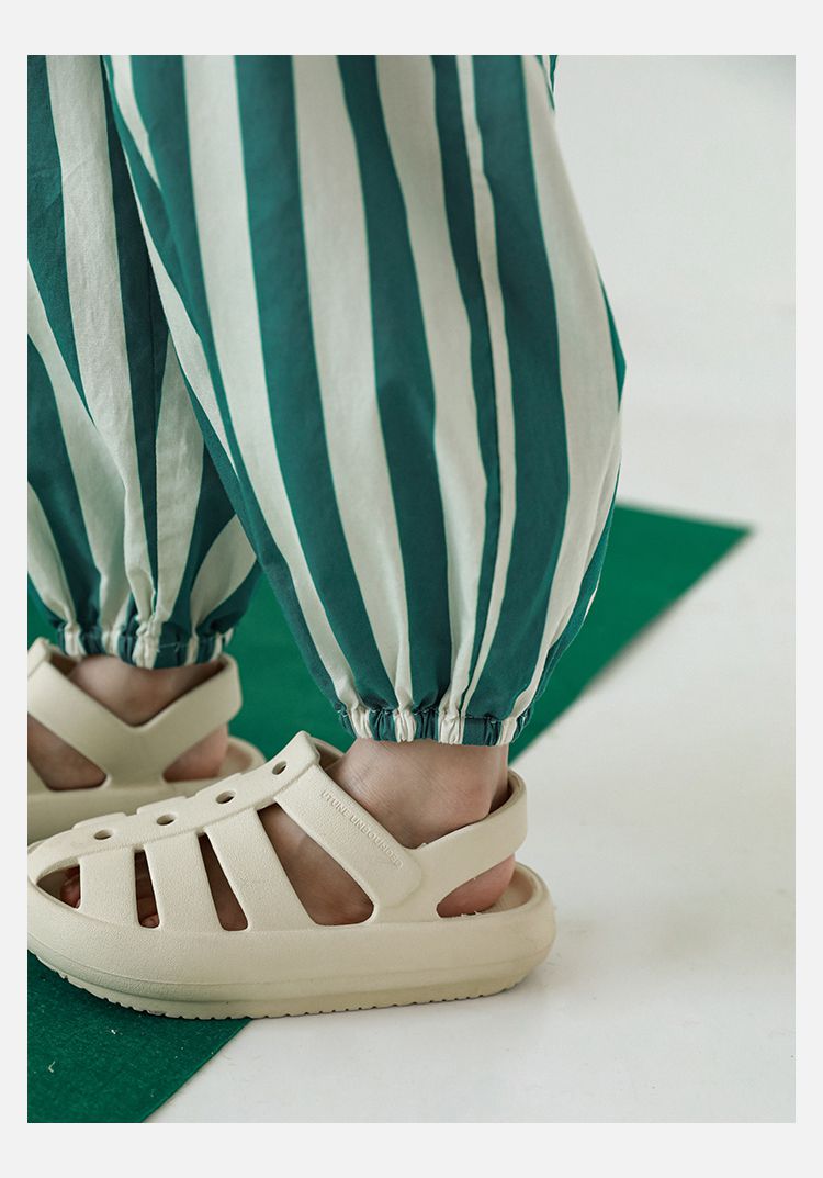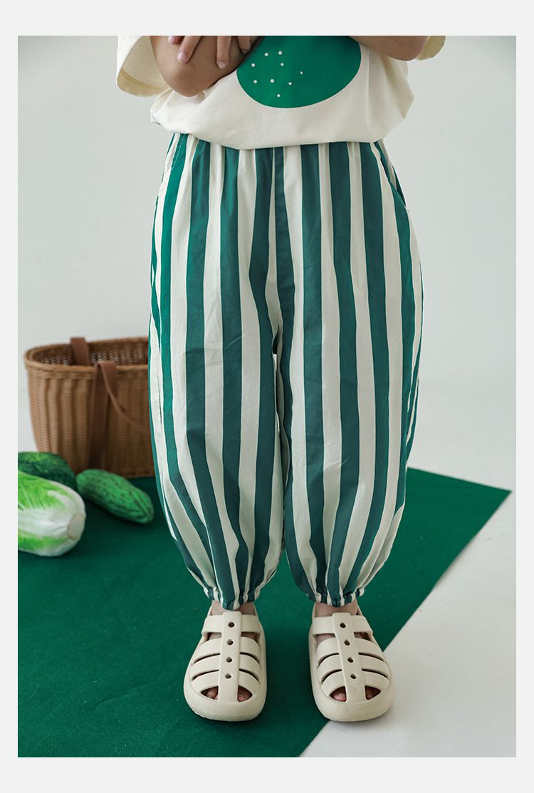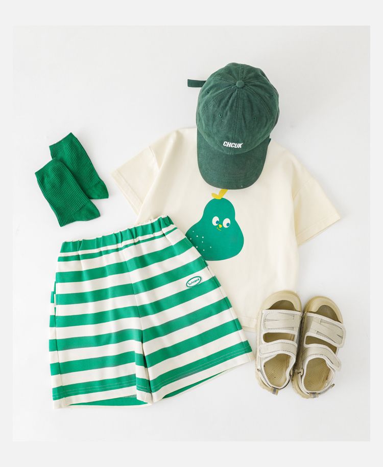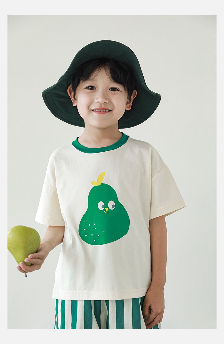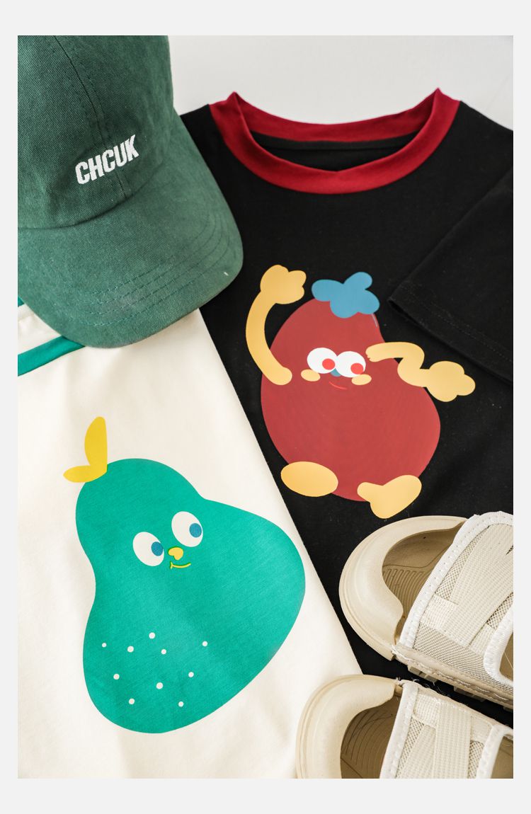 撞色圓領短袖上衣+條紋長褲套裝-蔬果派對-黑色