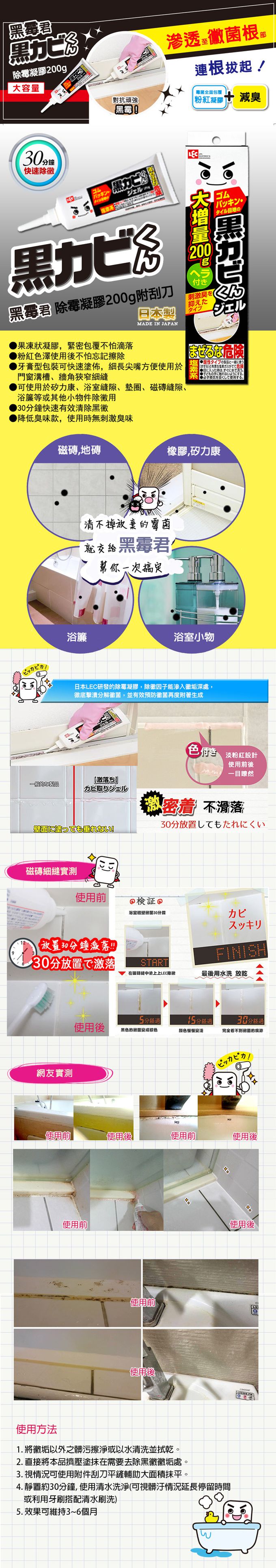 【使用方法】●1.使用時請務必保持空氣流通。●2.請將黴菌以外之髒污潔淨並待乾燥。●3.為避免造成其他物品染色,請事先貼好防護膠條。●4.覆蓋黴菌