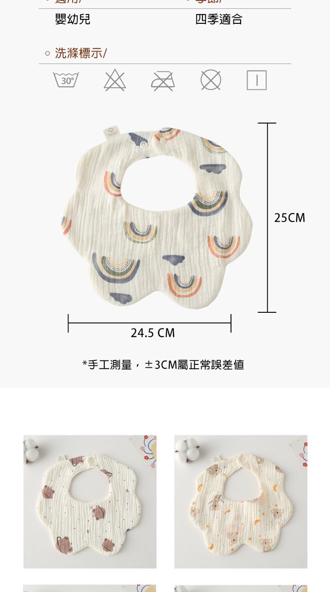 1.可愛花朵造型圍兜,紗布親膚透氣。