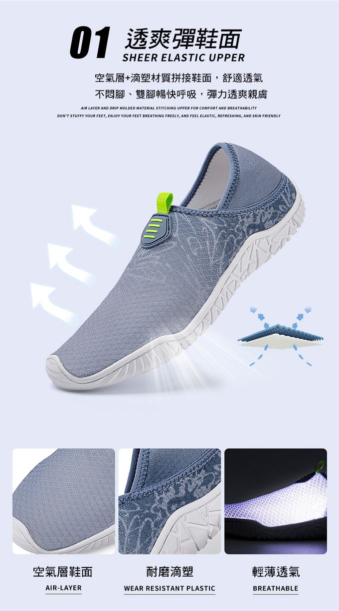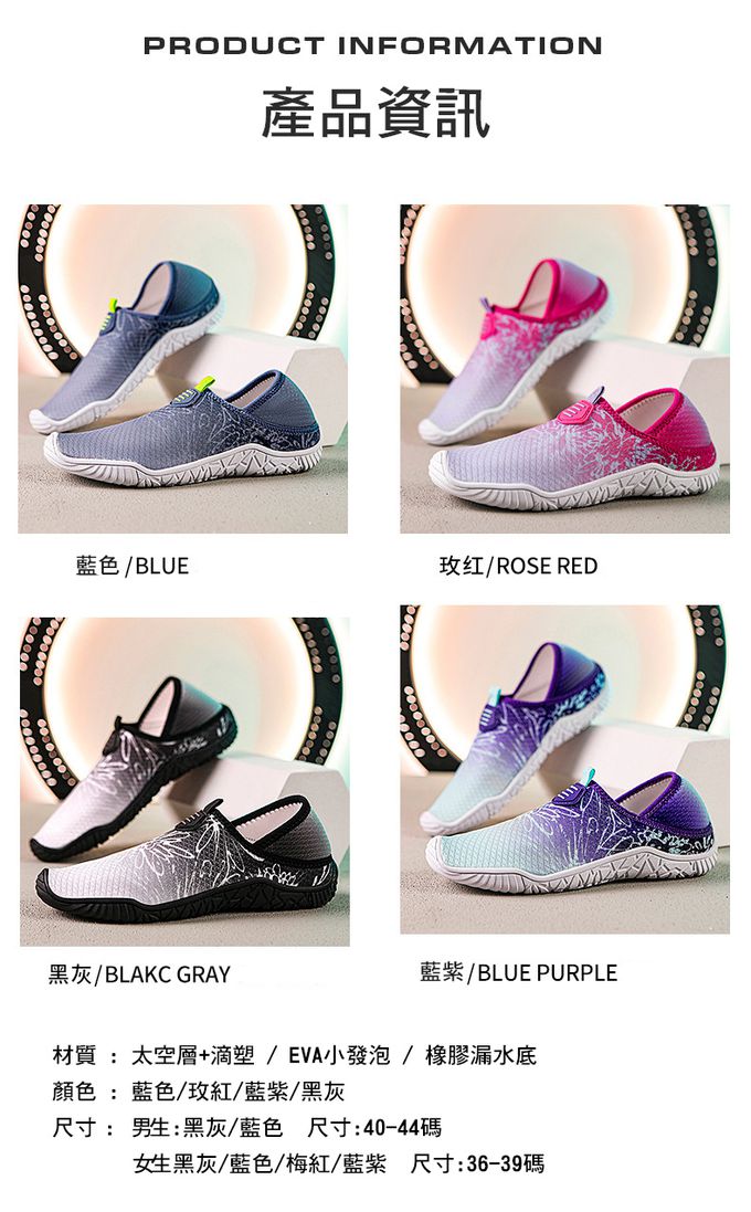 • 成分:男生:黑灰/藍色 尺寸:40-44 女生:藍色/玫紅/藍紫 尺寸:36-39 舒適透氣不悶腳 柔軟耐折不變形、走路輕鬆自在 吸汗散熱鞋墊,讓腳不悶臭 橡膠排水孔鞋底,防滑耐磨 並有效迅速排除多餘水分,抓地力穩