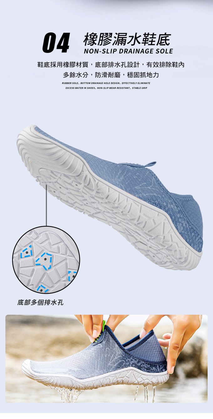 • 橡膠排水孔鞋底,防滑耐磨