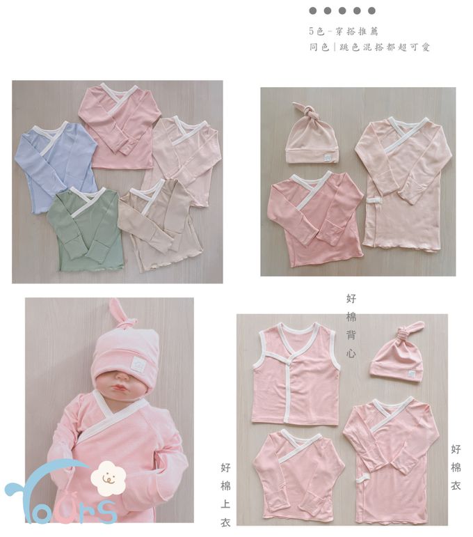 -新生兒親膚衣物(嬰幼兒包巾與背巾、包屁衣、學習褲、紗布衣等)。