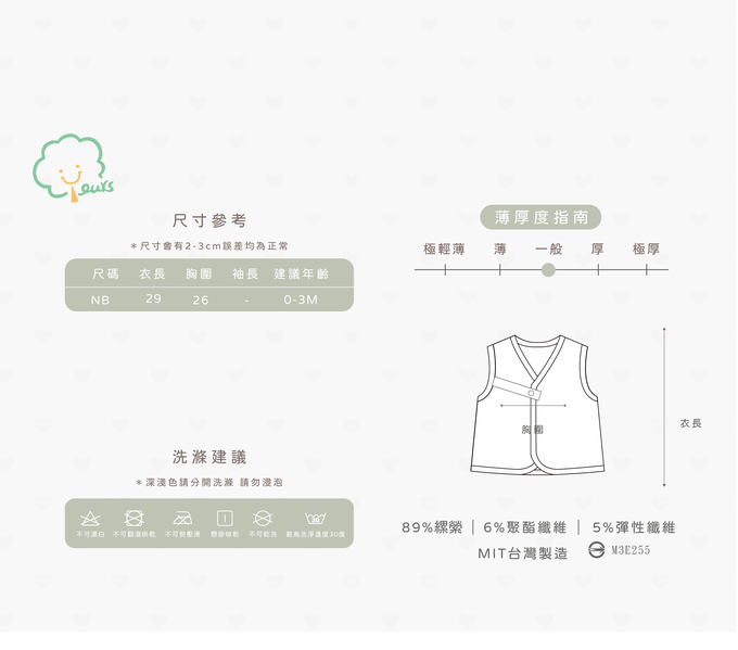 適合:喜歡給寶寶穿涼一點,或是有用新生兒包巾,內衣想單薄就選這件喔~