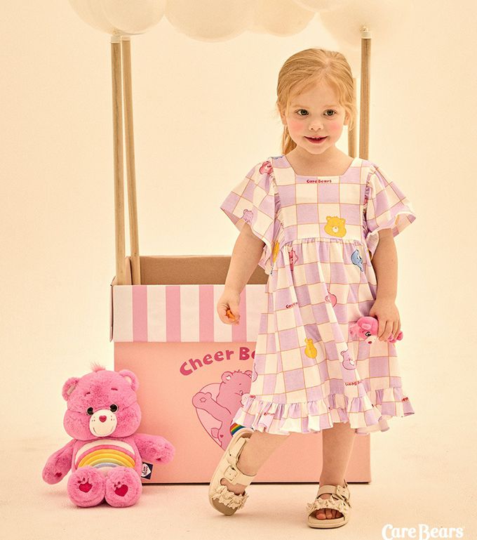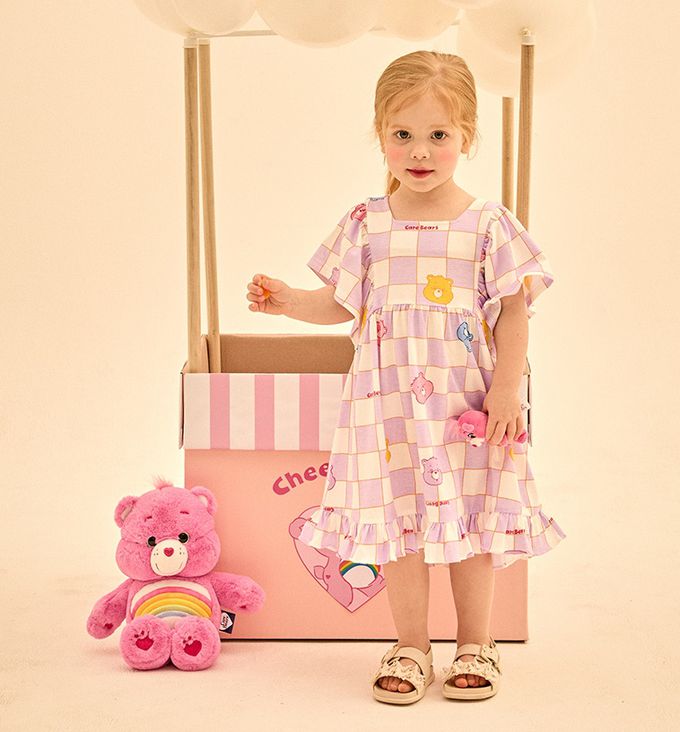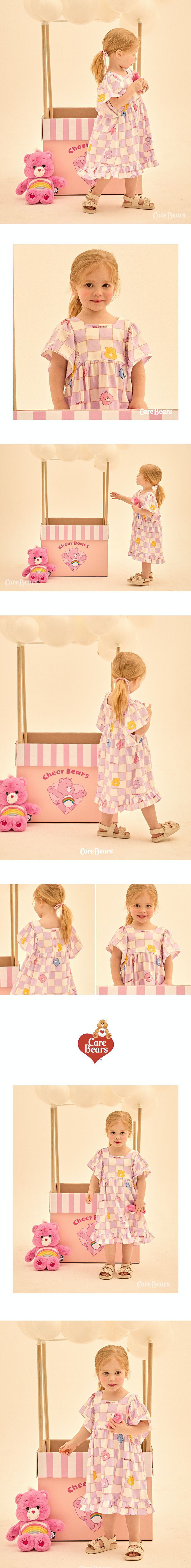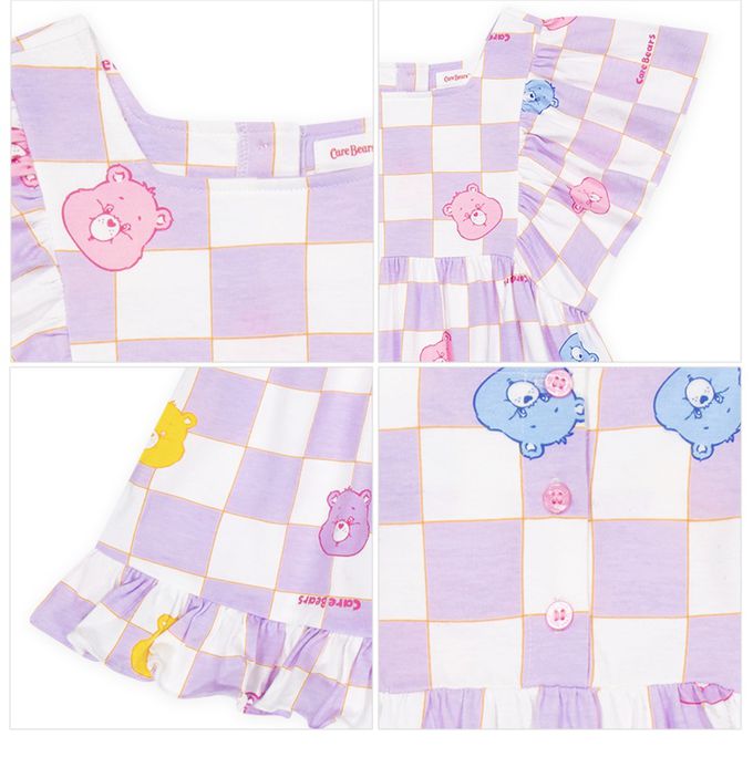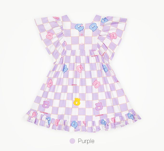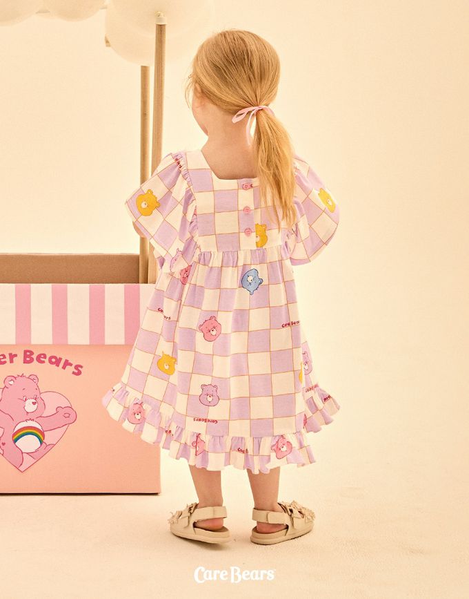 韓國 Care Bears - 聯名款棋盤格熊熊印方領洋裝-薰衣草紫