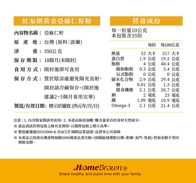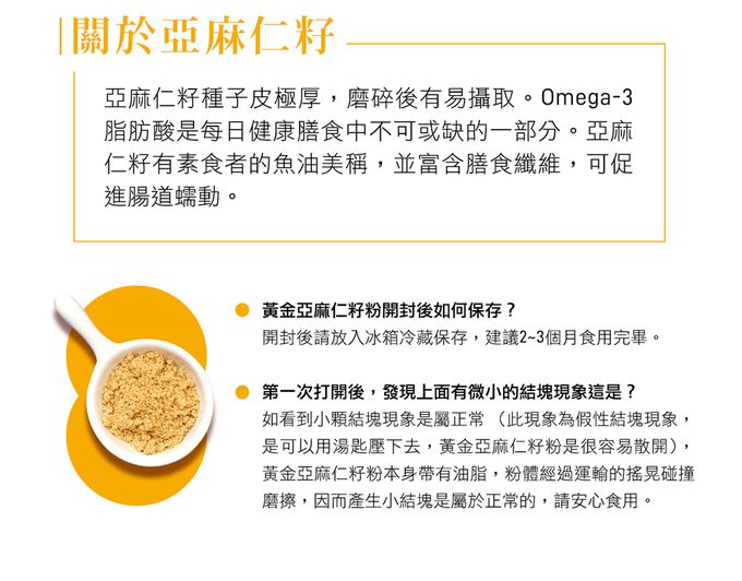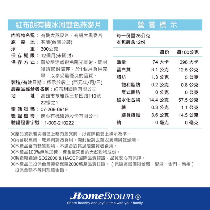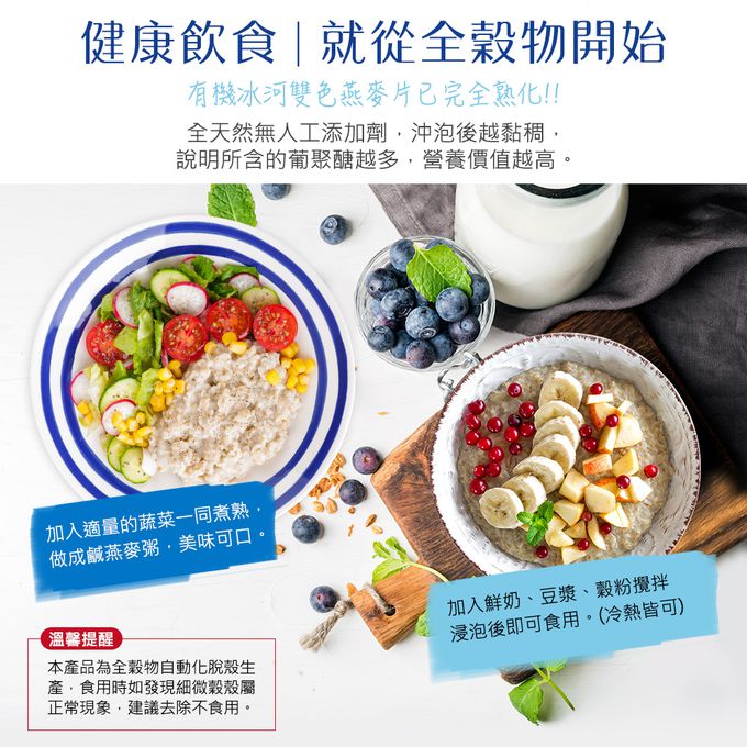 注意事項:*黃金亞麻仁籽粉內附內附脫氧劑,請勿食用 *有機冰河雙色燕麥片內附脫氧劑及乾燥劑,請勿食用