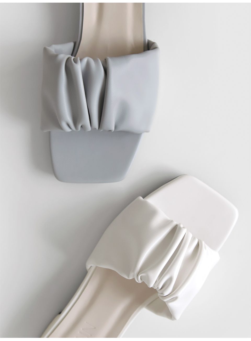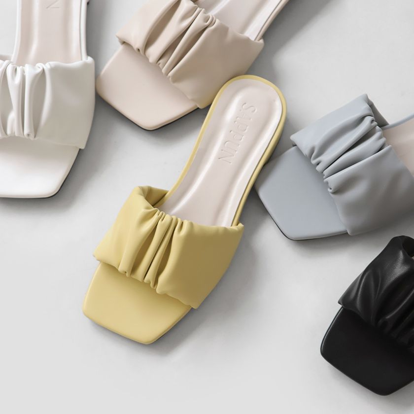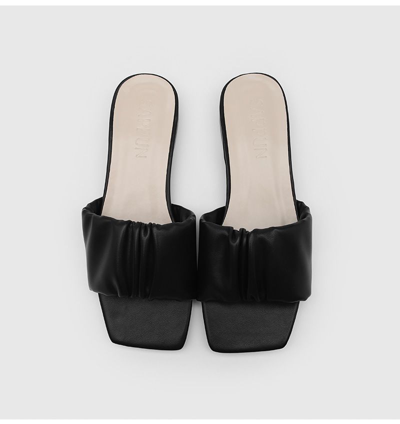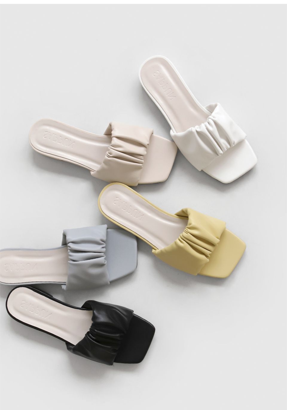 韓國 SAPPUN - 皺摺寬帶矮跟拖鞋-淺米杏