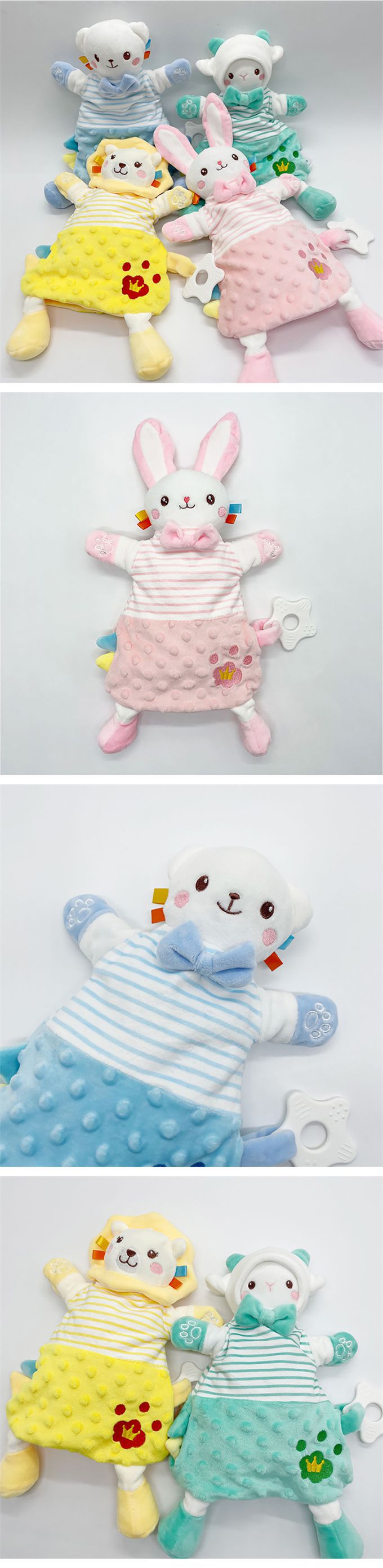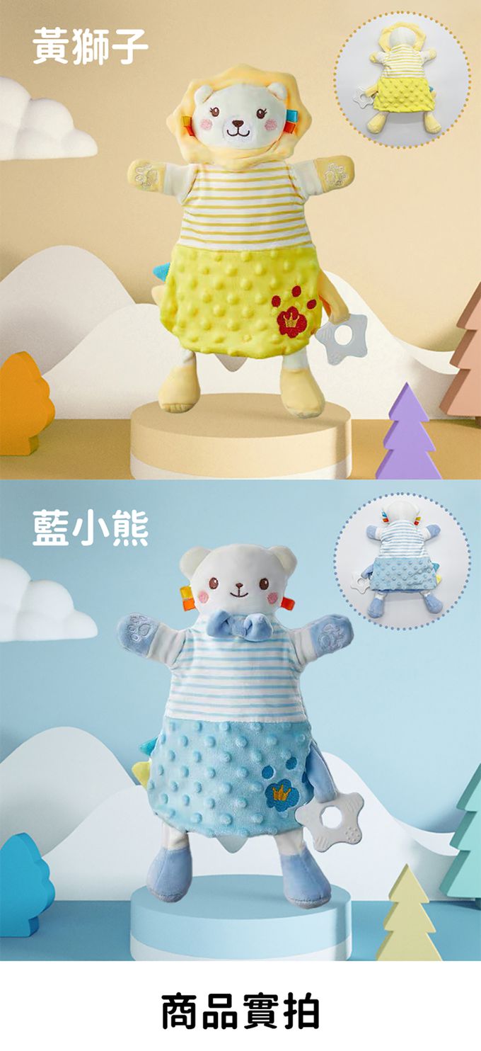4.玩偶旁均有鈴鐺、響紙和牙膠,可安心啃咬,亦鍛煉寶寶手指靈活性,盡情捏玩!