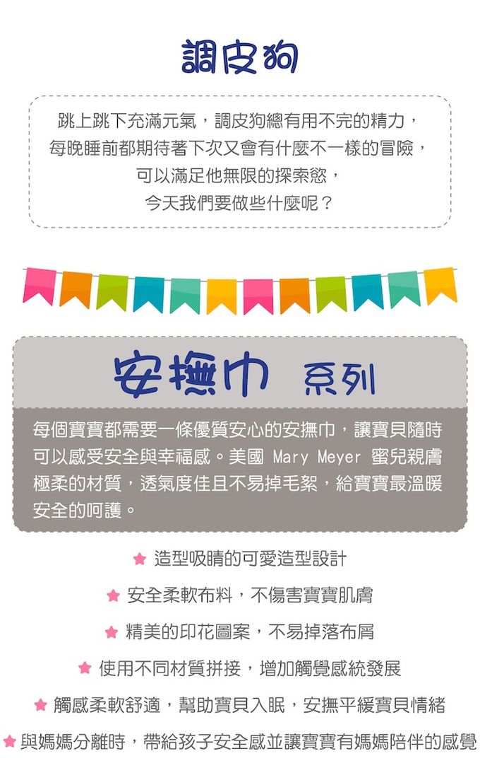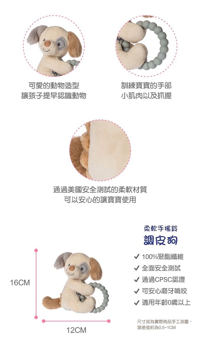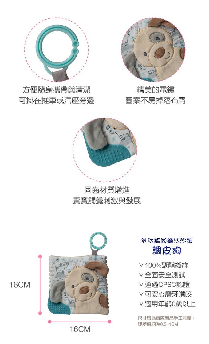●跳上跳下充滿元氣,調皮狗總有用不完的精力,每晚睡前都期待著下次又會有什麼不一樣的冒險,可以滿足他無限的探索慾,今天我們要做些什麼呢? ●最受孩子喜愛的調皮狗,中性顏色配色,燦爛的笑容,帶來一整天的好心情●寶貝最愛打結的角落●手搖鈴完美適合小手的尺寸易抓握,讓寶寶輕鬆訓練小手的肌肉●轉角固齒器的設計,讓口腔期的寶寶可以安心恣意的啃咬,滿足寶寶的需求●搓揉會有喀擦喀擦的觸感跟聲音,中間按壓有啾啾球發出啾啾的聲音●纖細柔軟不傷害寶寶柔嫩肌膚●不同的布料刺激觸覺,有效的安撫寶寶