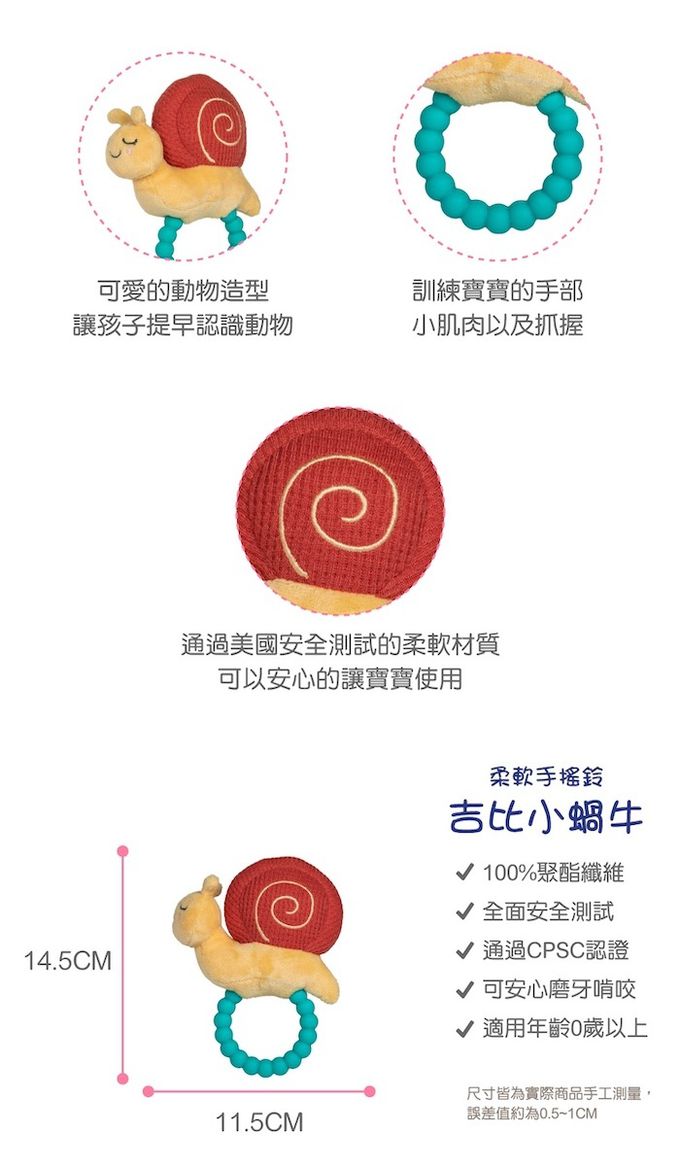 ●可愛小蝸牛像吉比花生醬一樣柔滑甜順,但甜度恰到好處,凡事慢慢來不要急●觸感柔軟且帶給寶寶安全感,陪伴寶寶讓他勇敢自行入睡●寶貝最愛打結的角落●矽膠材質的手把可當固齒器,讓寶寶口慾期不亂放東西在嘴巴,也可舒緩口腔不適●完美適合小手的尺寸易抓握,讓寶寶輕鬆訓練小手的肌肉●纖細柔軟不傷害寶寶柔嫩肌膚●不同的布料刺激觸覺,有效的安撫寶寶
