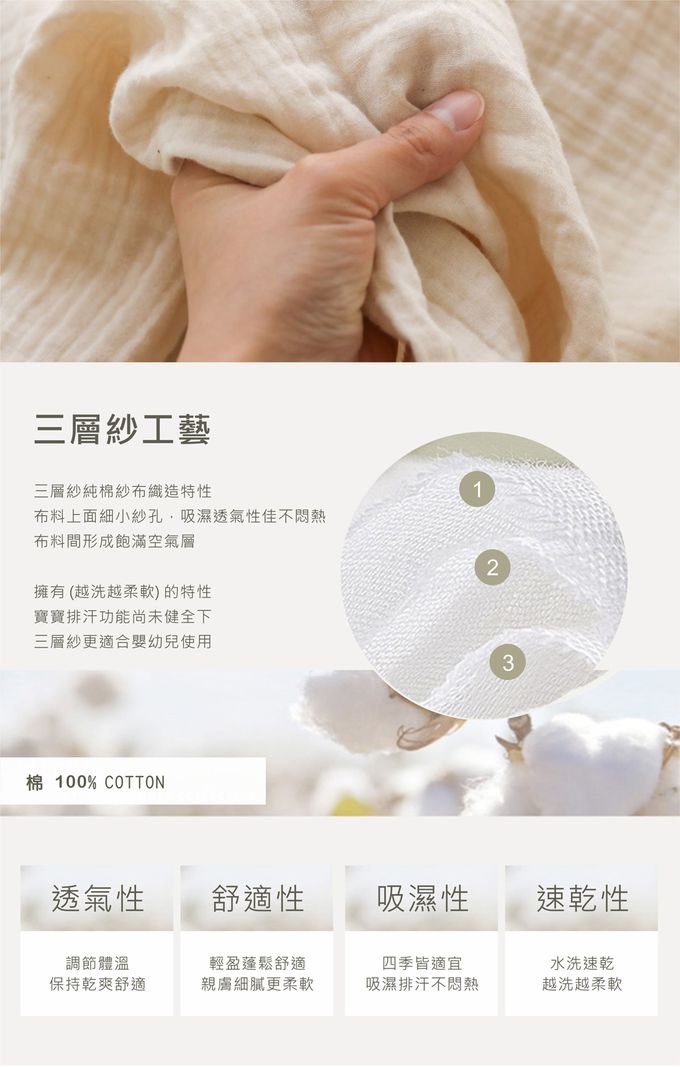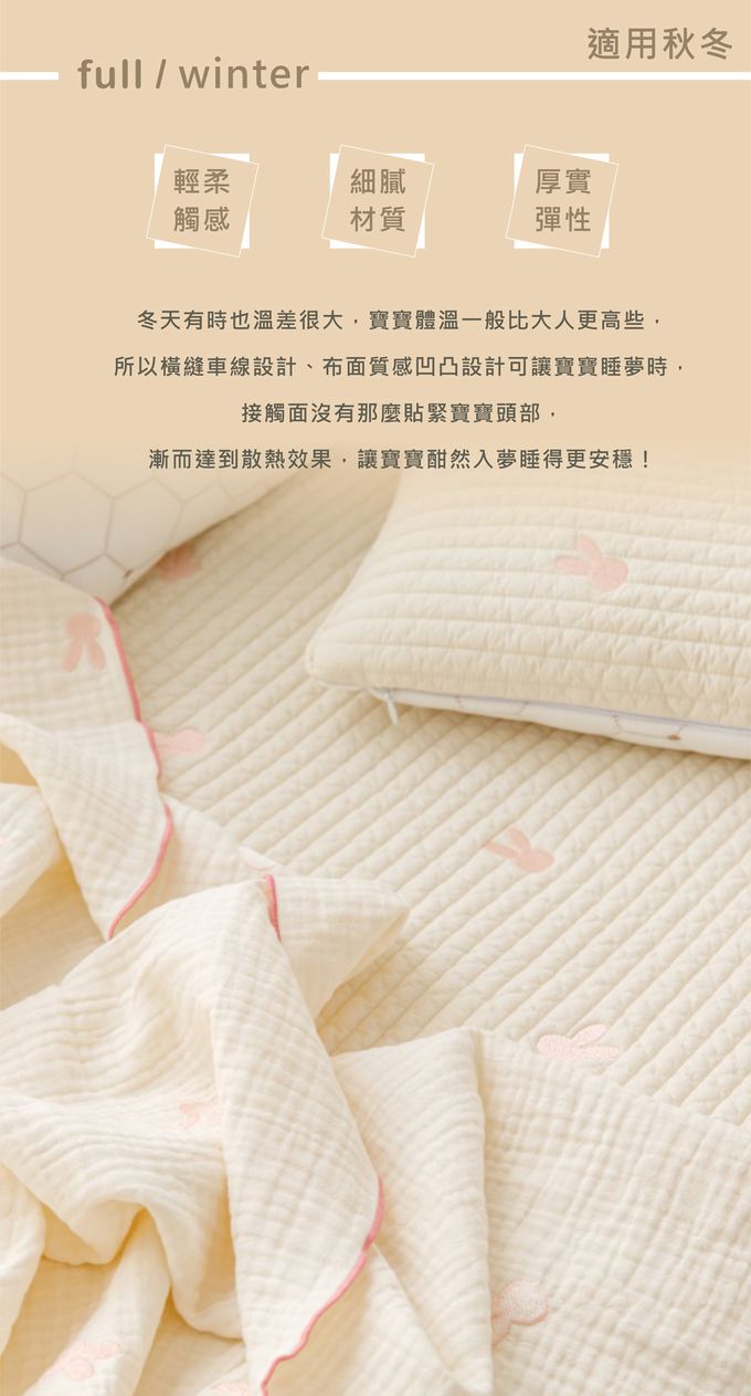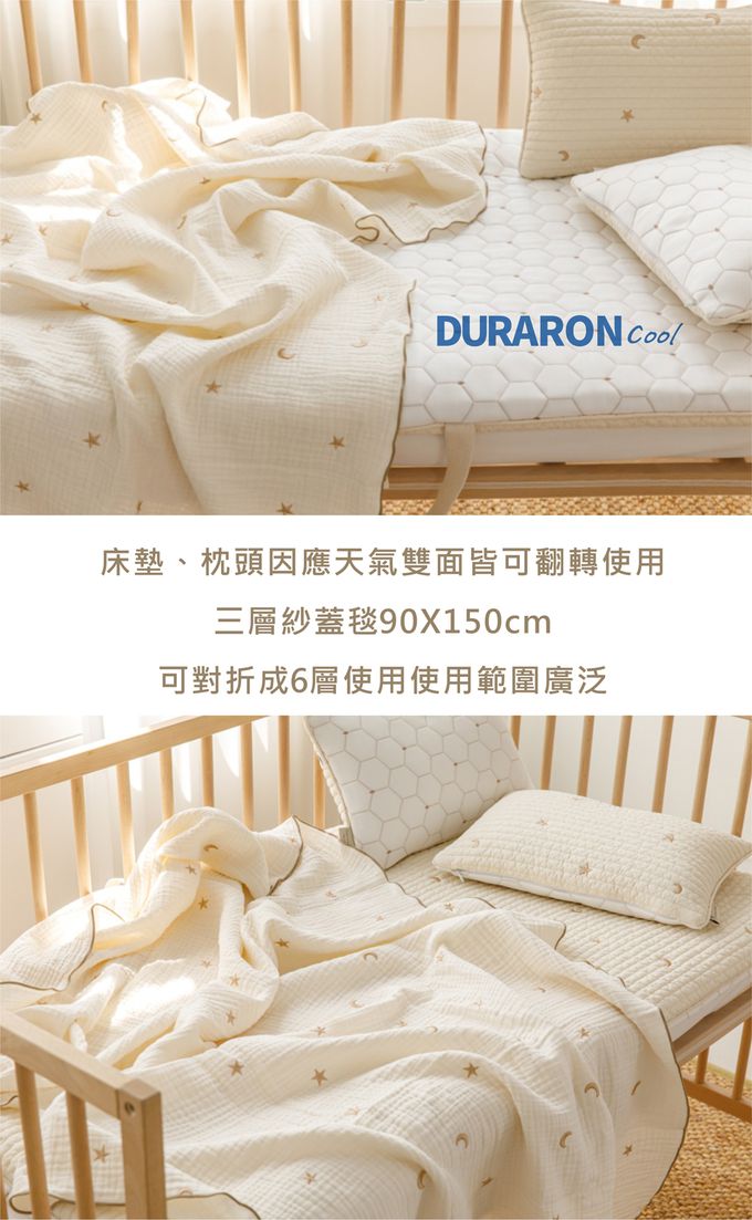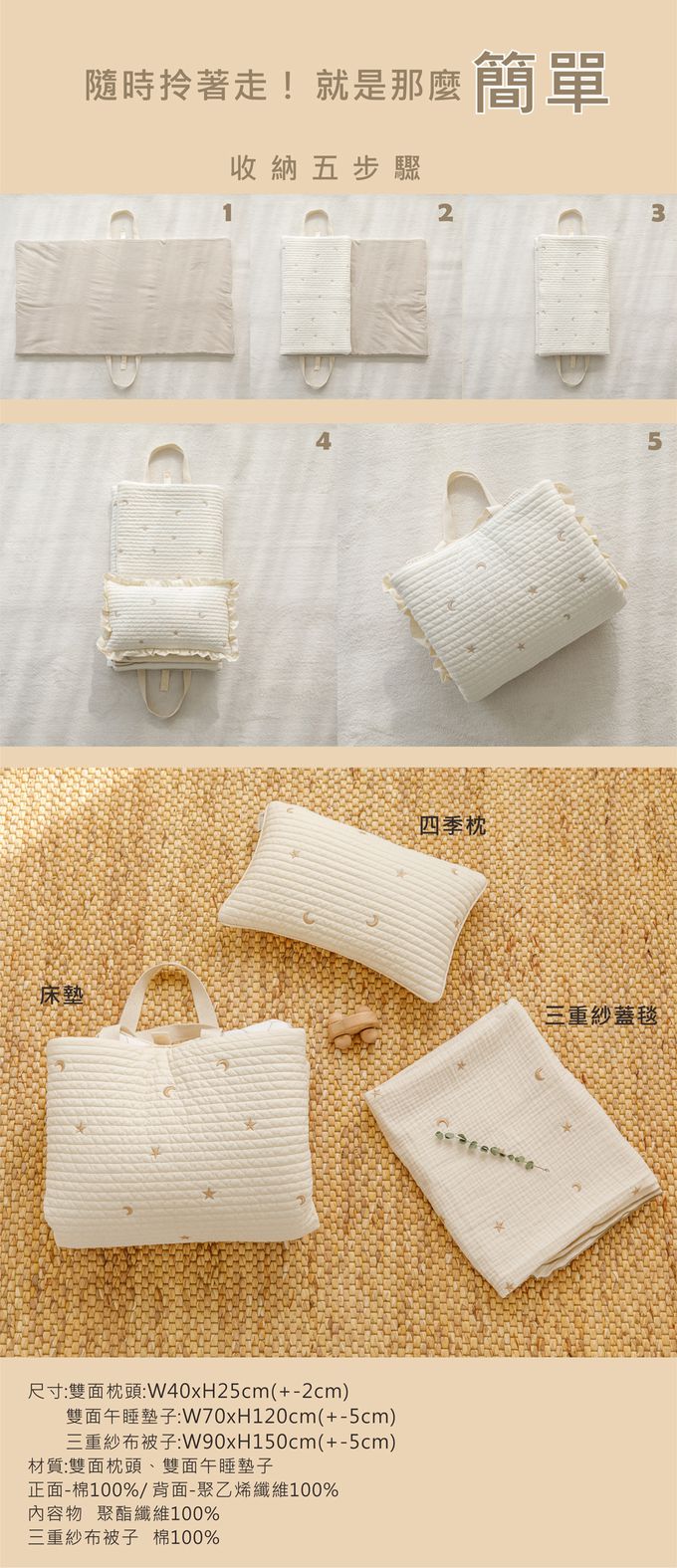 材質:材質:雙面枕頭、雙面午睡墊子 正面-棉100%/ 背面-聚乙烯纖維100% 內容物 聚酯纖維100% 三重紗布被子 棉100%