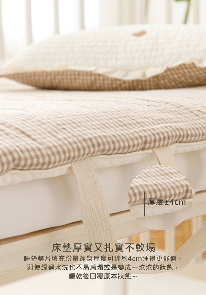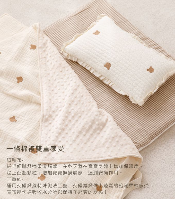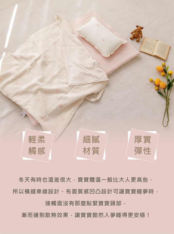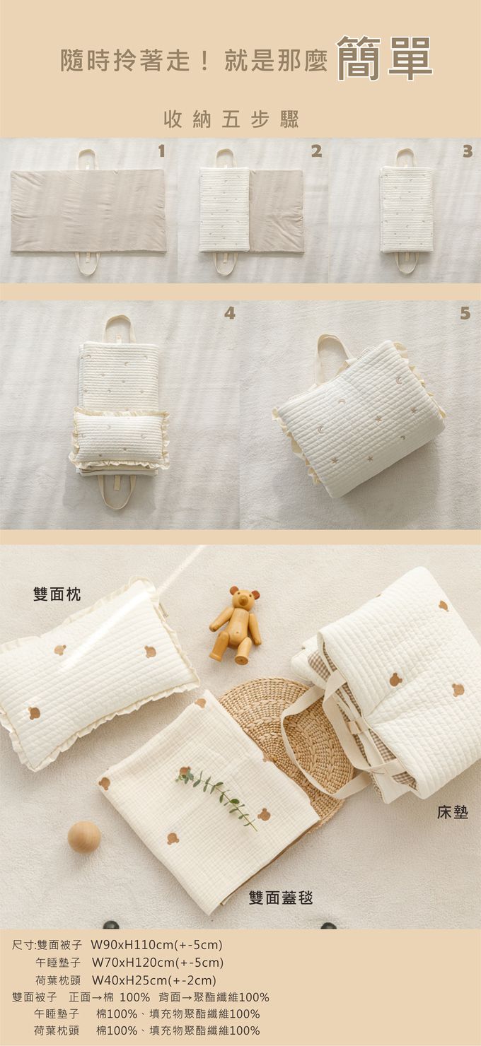材質:雙面被子 正面→棉 100% 背面→聚酯纖維100% 午睡墊子 棉100%、填充物聚酯纖維100% 荷葉枕頭 棉100%、填充物聚酯纖維100%
