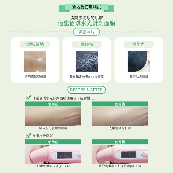 BANONAGI 水光針劑面膜為您打造最強補水後盾,我們添加天然蜂蜜及檸檬萃取物並搭配優質玻尿酸鈉,為您提供穩定高效的保濕效果。再透過光果甘草、互生葉白千層葉及辣薄荷萃取物達到肌膚鎮靜,提升肌膚自我保護力的功效,只要一片,保濕補水、保養防護通通都有!