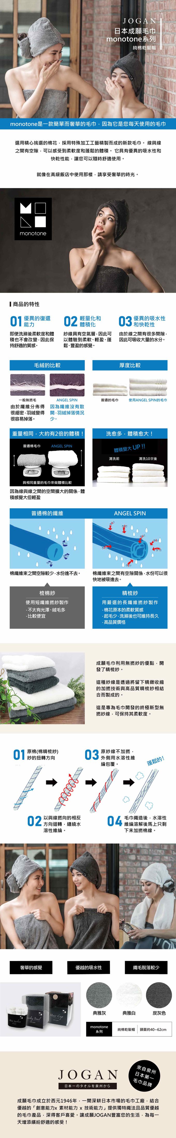 monotone系列採精心挑選的棉花,採用特殊加工工藝精製而成的新款毛巾、乾髮帽及髮帶等系列商品,布的線與線之間有空隙,可以感受到柔軟度和蓬鬆的觸感,具有優異的吸水性和快乾性能,讓您可以隨時舒適使用,享受奢華的時光。