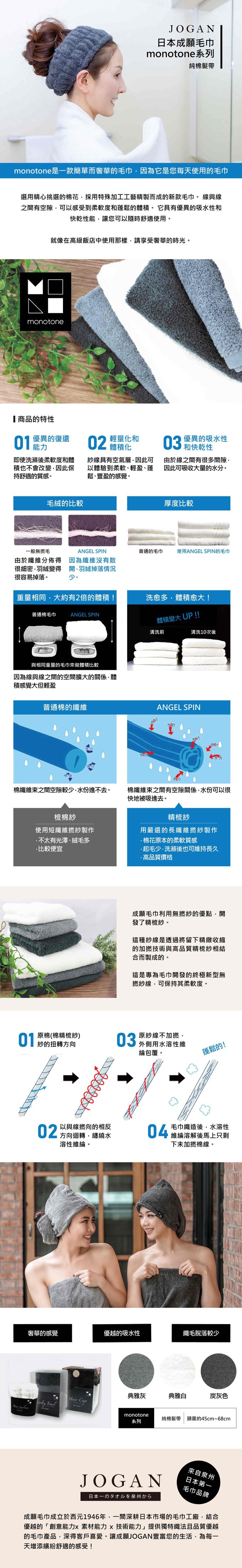 monotone系列採精心挑選的棉花,採用特殊加工工藝精製而成的新款毛巾、乾髮帽及髮帶等系列商品,布的線與線之間有空隙,可以感受到柔軟度和蓬鬆的觸感,具有優異的吸水性和快乾性能,讓您可以隨時舒適使用,享受奢華的時光。